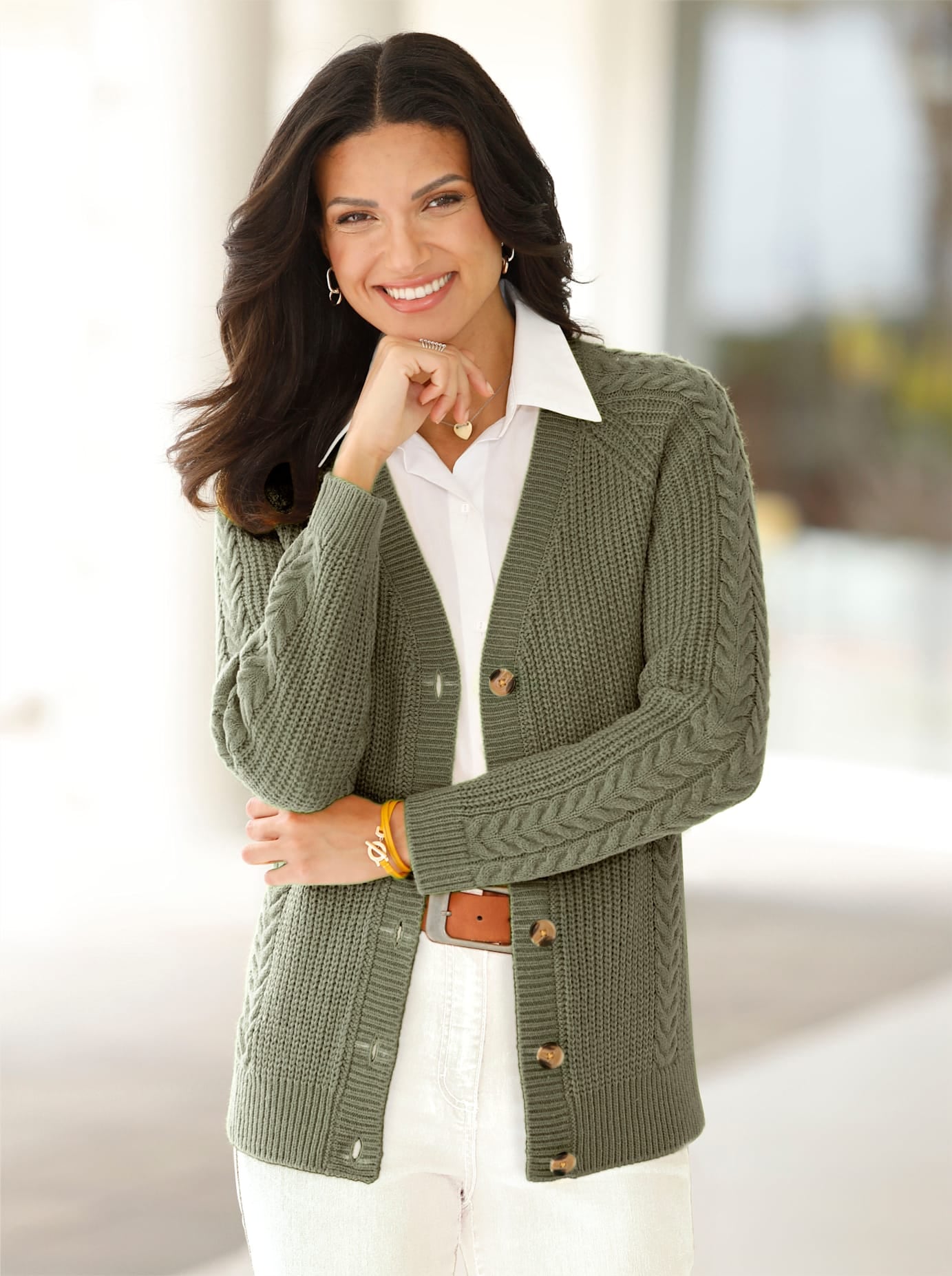 - klassischen Cardigans und Longjacken mit Knöpfen,