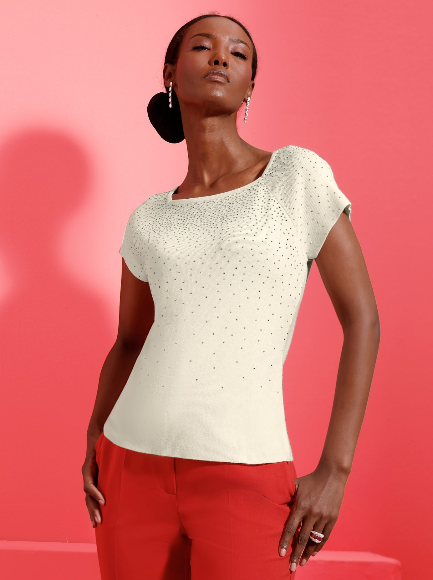 - Le pull comprime visuellement un cou plus long et crée ainsi une apparence générale harmonieuse.