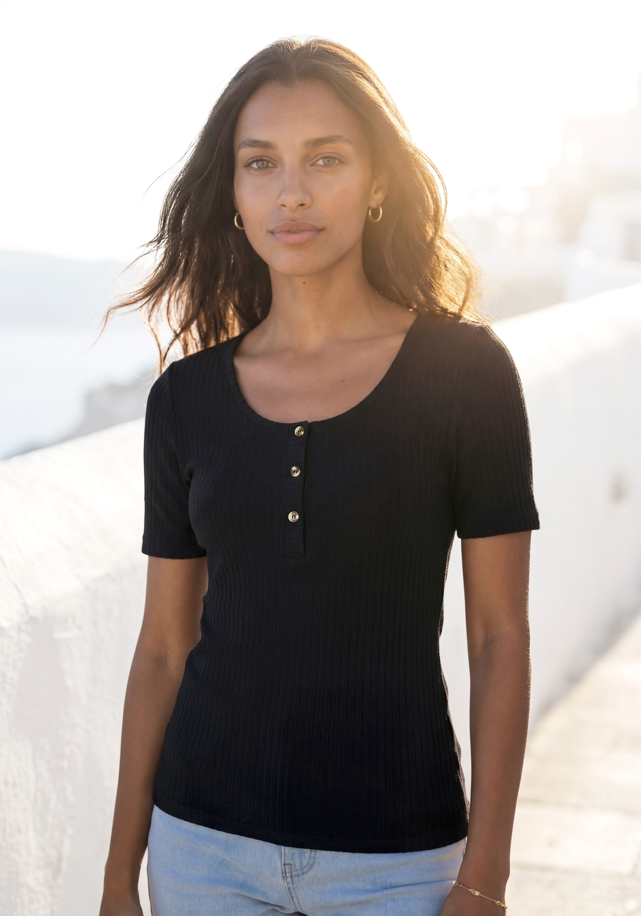- T-shirt »mit kurzer Knopfleiste« aus weicher Viskose-Ripp-QualitätLASCANAPrix actueldès 34.90 CHF