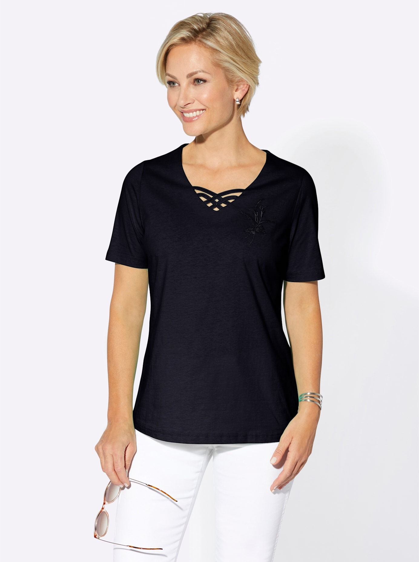 Die effektvolle Ausschnittlösung zieht die Blicke auf sich! Shirt mit gekreuzten Bändern am Rundhals-Ausschnitt. 100% Baumwolle. Maschinenwäsche.