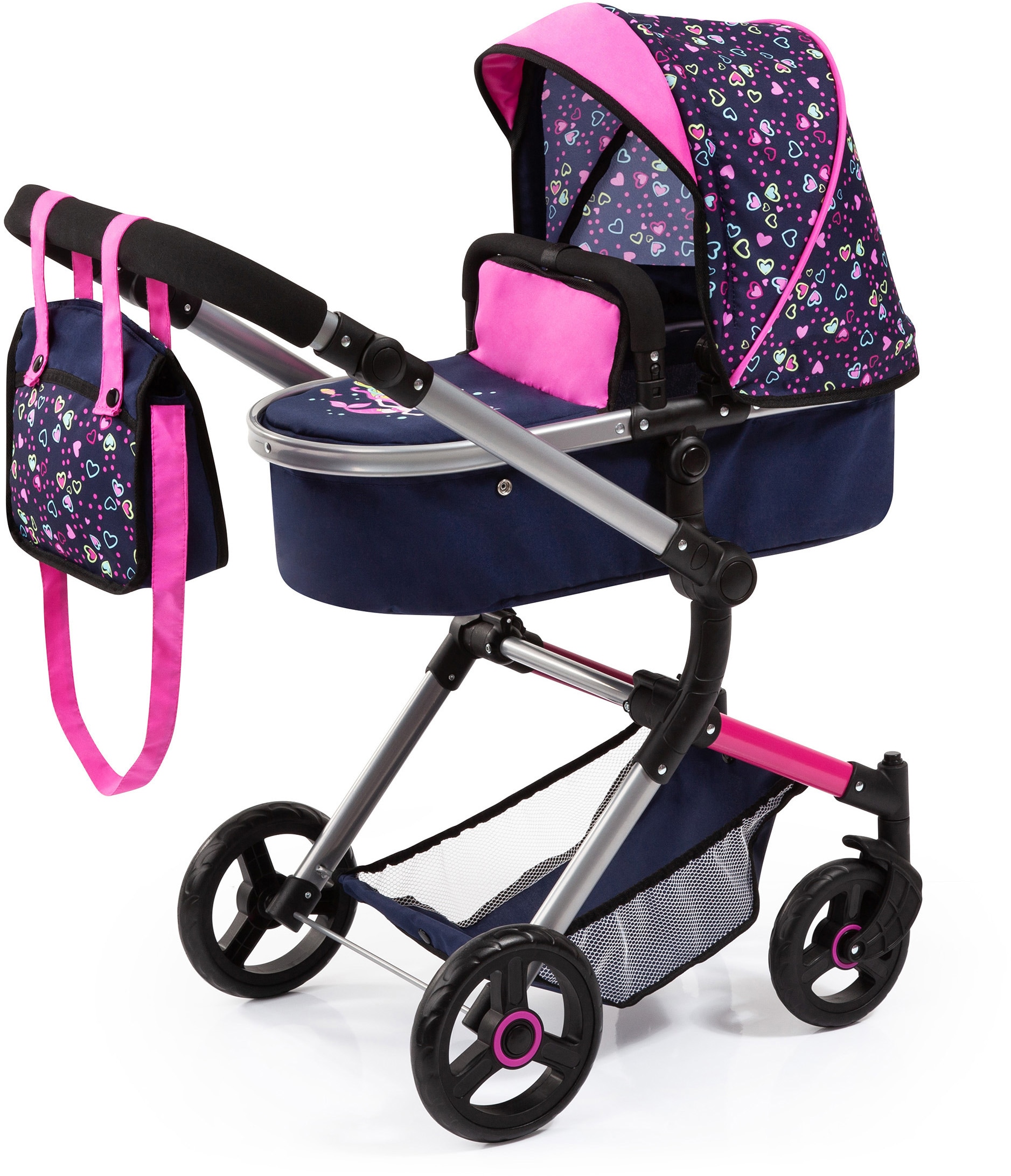 Bayer Poussette de poupée combinée »Vario, Blau/Pink/Herzchen« inkl. Wickeltasche