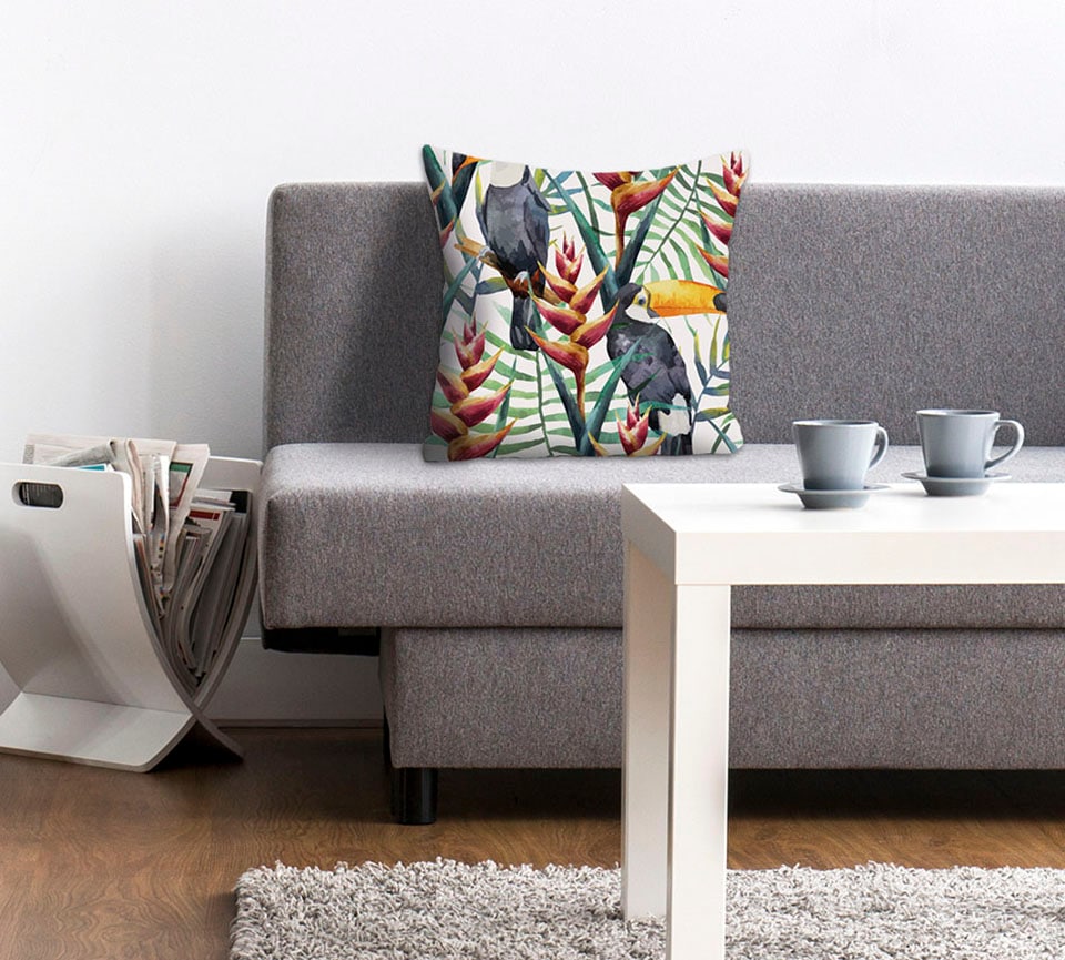 queence Coussin décoratif »Lea« Kissenhülle,Tukan,Exotisch,Bunt,Vogel,Tropisch,Dschungel,Fröhlich