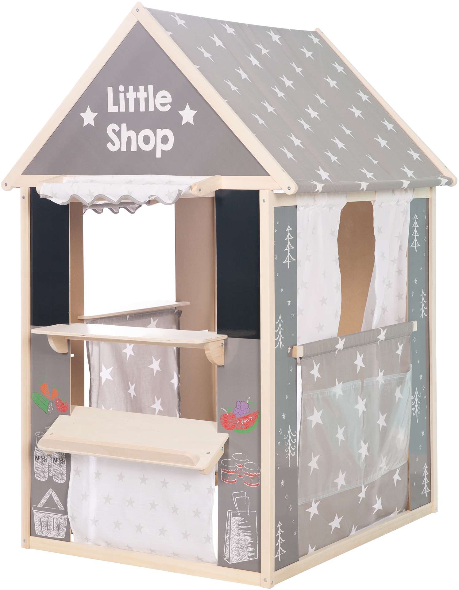 - Mit 4 verschiedenen Spielseiten, verwendbar als Kaufladen, Kaspertheater, Tafel, Schalter für Post/Bank
