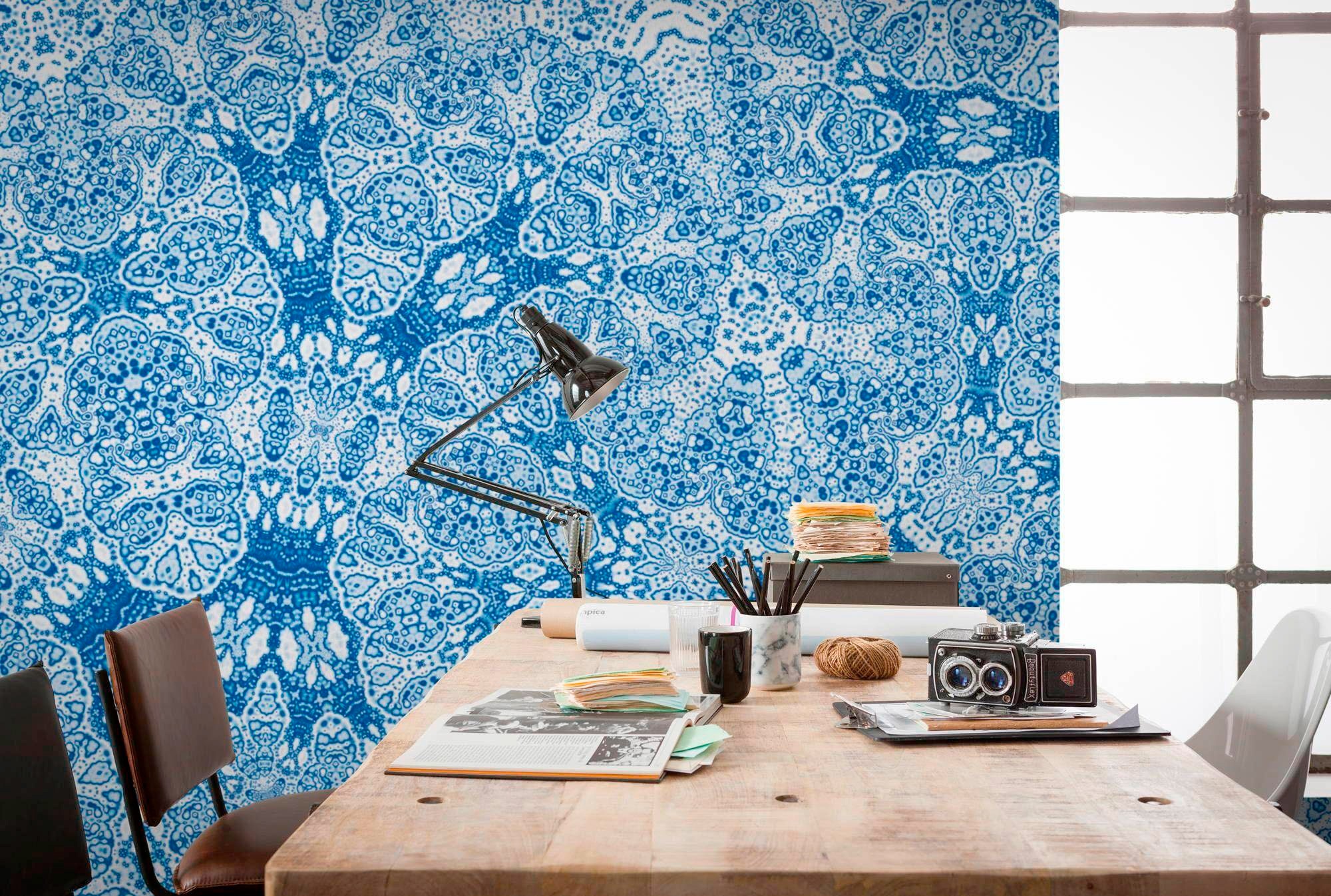 - Kleister (im Lieferumfang enthalten) auf die zu tapezierende Wand auftragen und die passgenauen Bahnen Stoss-an-Stoss an der Wand anbringen.