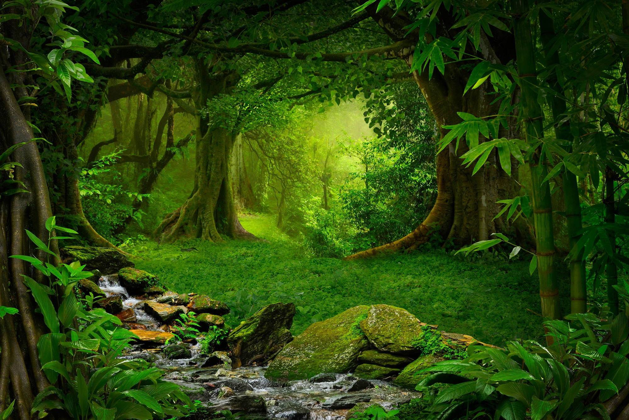 Vliestapete, WASSERFALL-BÄUME FLUSS SEE STEINE BLUMEN BERGE SONNE, Poster, Dekoration, Landschaft, Stadt, Stilleben, verschiedene Grössen von 2m- 10m Breite, wählen Sie Ihre Grösse
