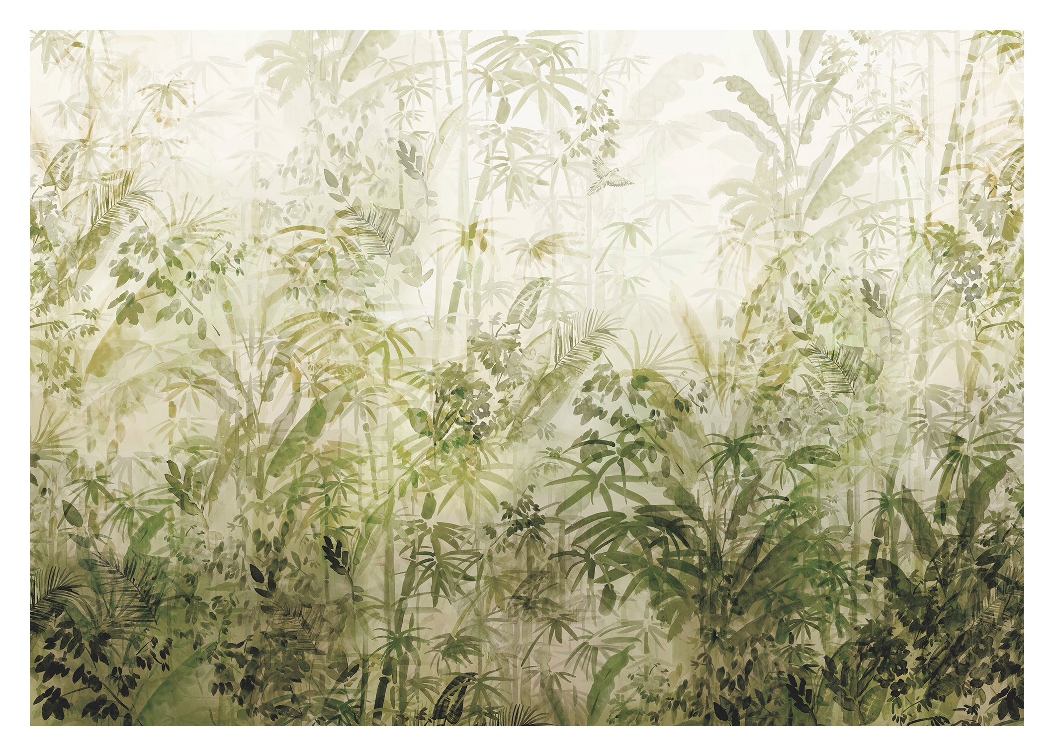 Dieser Palmenprint in erfrischenden Grüntönen, schafft einen Ort der Gemütlichkeit. Wie als wäre es ein Schattenspender ranken die grossen Blätter der Palmen mitten ins Bild und ziehen die Blicke ihrer Betrachter auf sich.