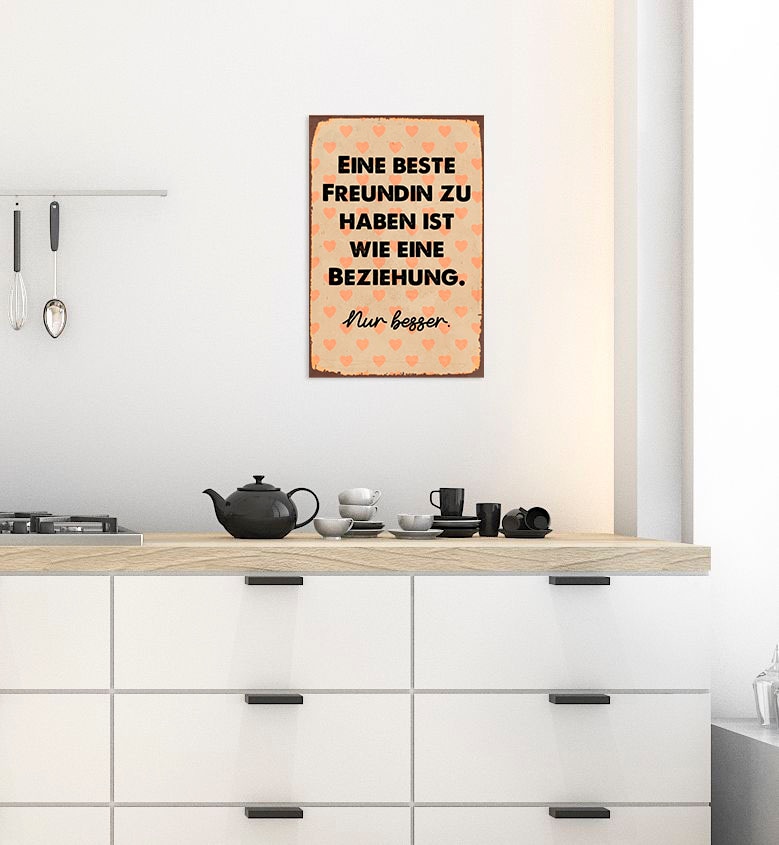 Der DEKO-KLASSIKER neu interpretiert: Blechschilder im Vintage-Look! Sei es aufgrund der abgebildeten Motive oder schlicht aufgrund eines witzigen Spruchs: Blechschilder sind in der modernen Wandgestaltung nicht mehr wegzudenken. Seit vielen Jahren sind Metallschilder beliebte und begehrte Dekorationsobjekte und bieten eine ideale Möglichkeit, Geschmack und Persönlichkeit in die eigenen vier Wände zu bringen. Durch die einzigartige Stahloptik wirkt das Bild sehr edel und dank der Vorbohrung ist das Blechschild leicht und in kürzester Zeit an jedem gewünschten Ort platziert. Ob in der Küche, dem Wohnzimmer, an der Bar, im Flur oder an einer anderen Stelle - mit den modernen Blechbildern kannst Du nach Belieben deine Wände dekorieren. Die Blechschilder sind auch für den Outdoorbereich geeignet!