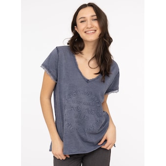 ausgefranster V-Ausschnitt, Used Look, Langarm, Schriftzug