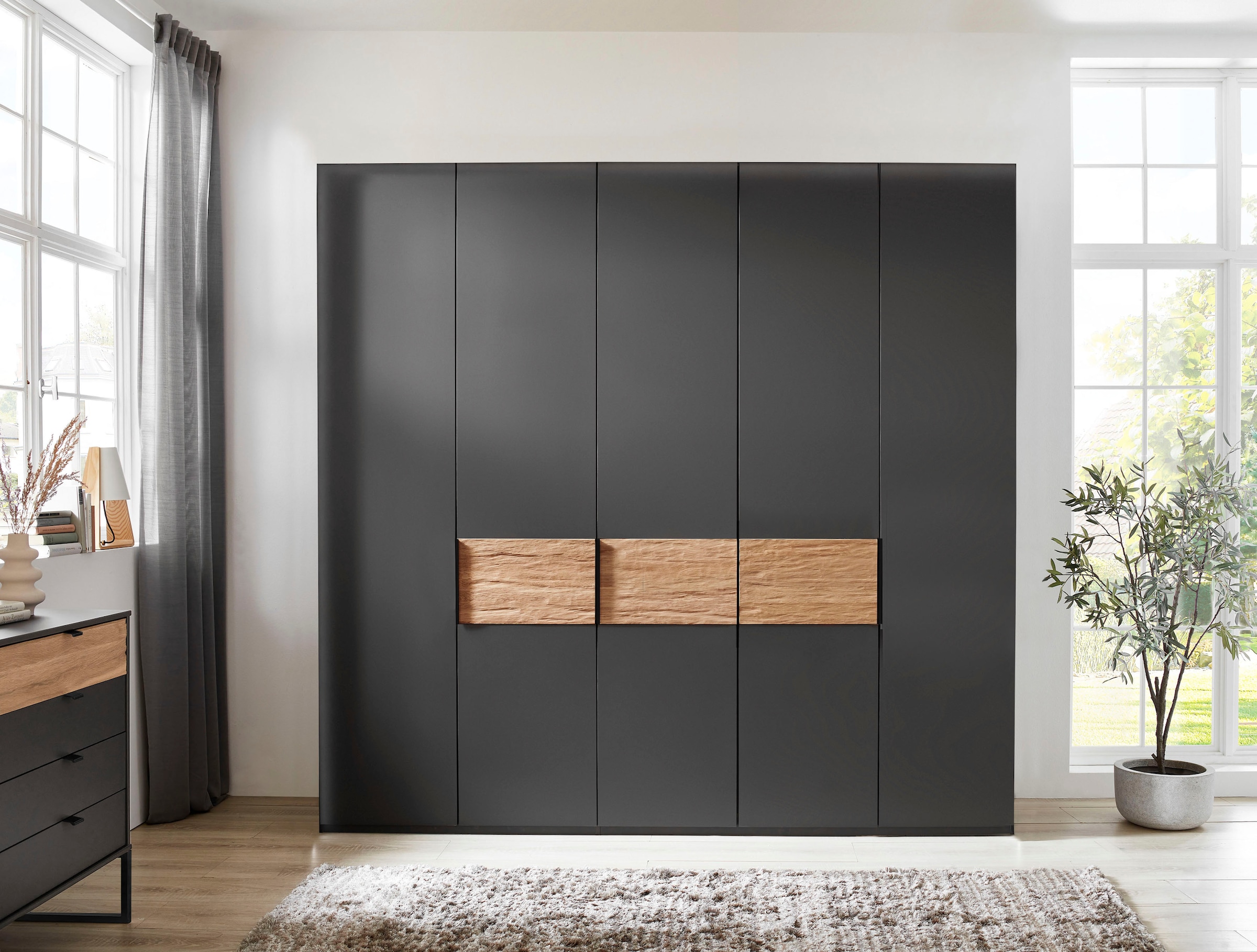 Aspect de la surface de la façade | Aussentüren im Korpus Farbton;Mittig Rahmentüren in Graphit-Dekor;Füllungen in Glas Parsol grau |