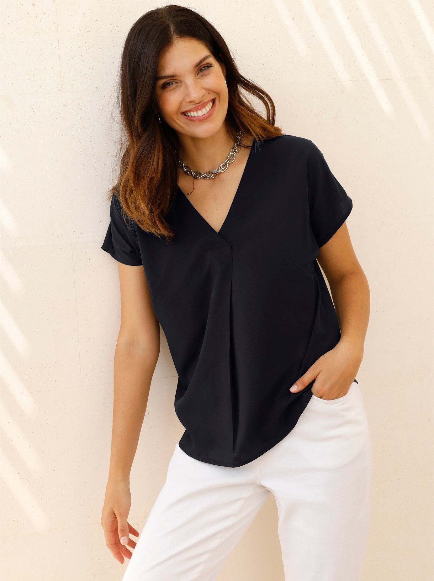 Diese luftige Schlupfbluse braucht jede Frau im Kleiderschrank! Rundhals-Ausschnitt mit kleinem V und breiter Blende. Überschnittene Schultern und formgebende Brustabnäher. 100% Polyester. Maschinenwäsche.