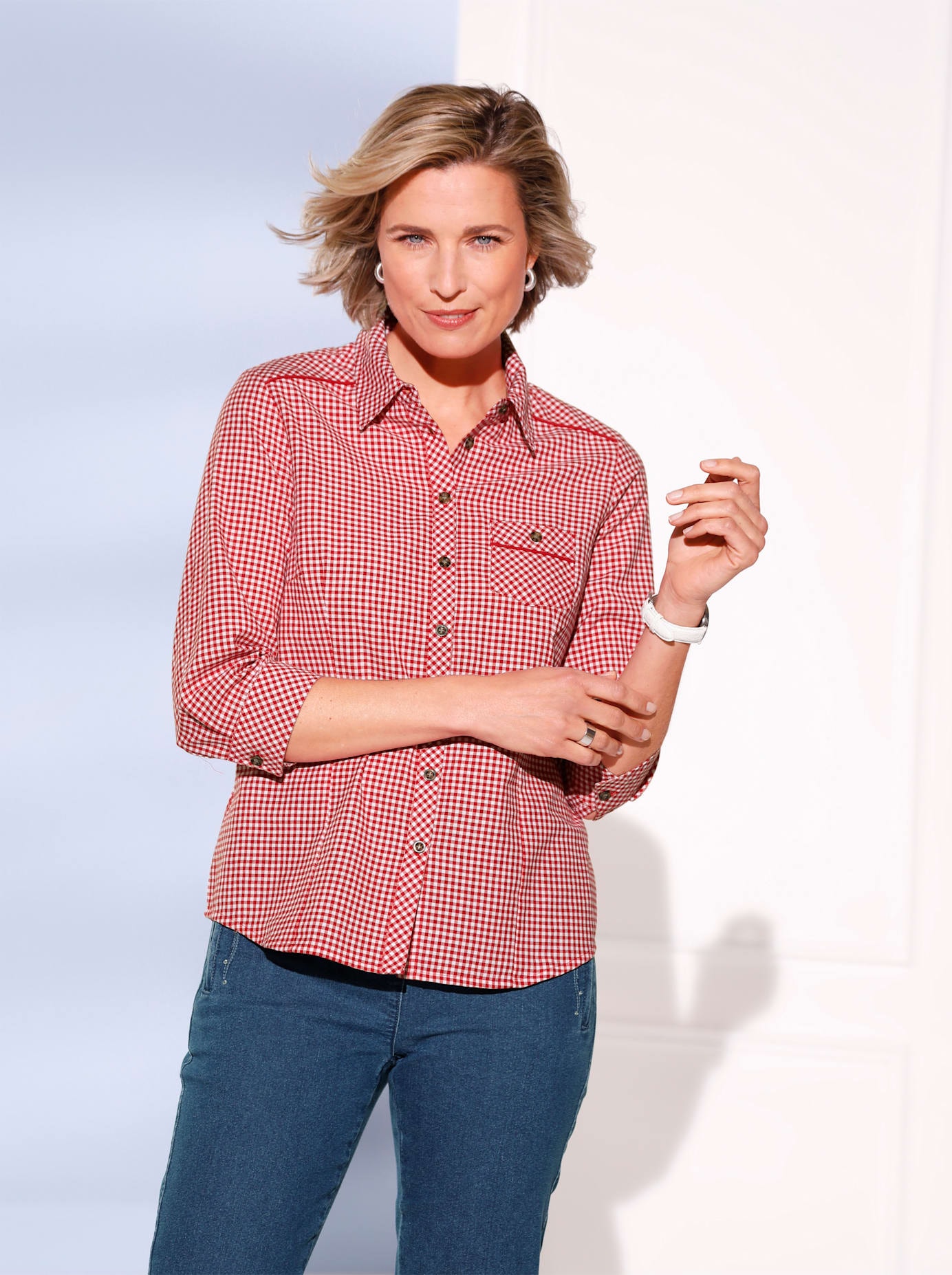 Kombifreundliche Karo-Bluse im hochwertig garngefärbten Muster. Mit Hemdkragen und durchgehender Knopfleiste. Schulterpasse vorne und hinten, Brustabnäher sowie Taillenabnäher hinten für eine tolle Passform. 1 aufgesetzte Brusttasche und 3/4-Ärmel mit Knopfmanschetten. Leicht abgerundeter Saum vorne und hinten. 100% Baumwolle. Maschinenwäsche.