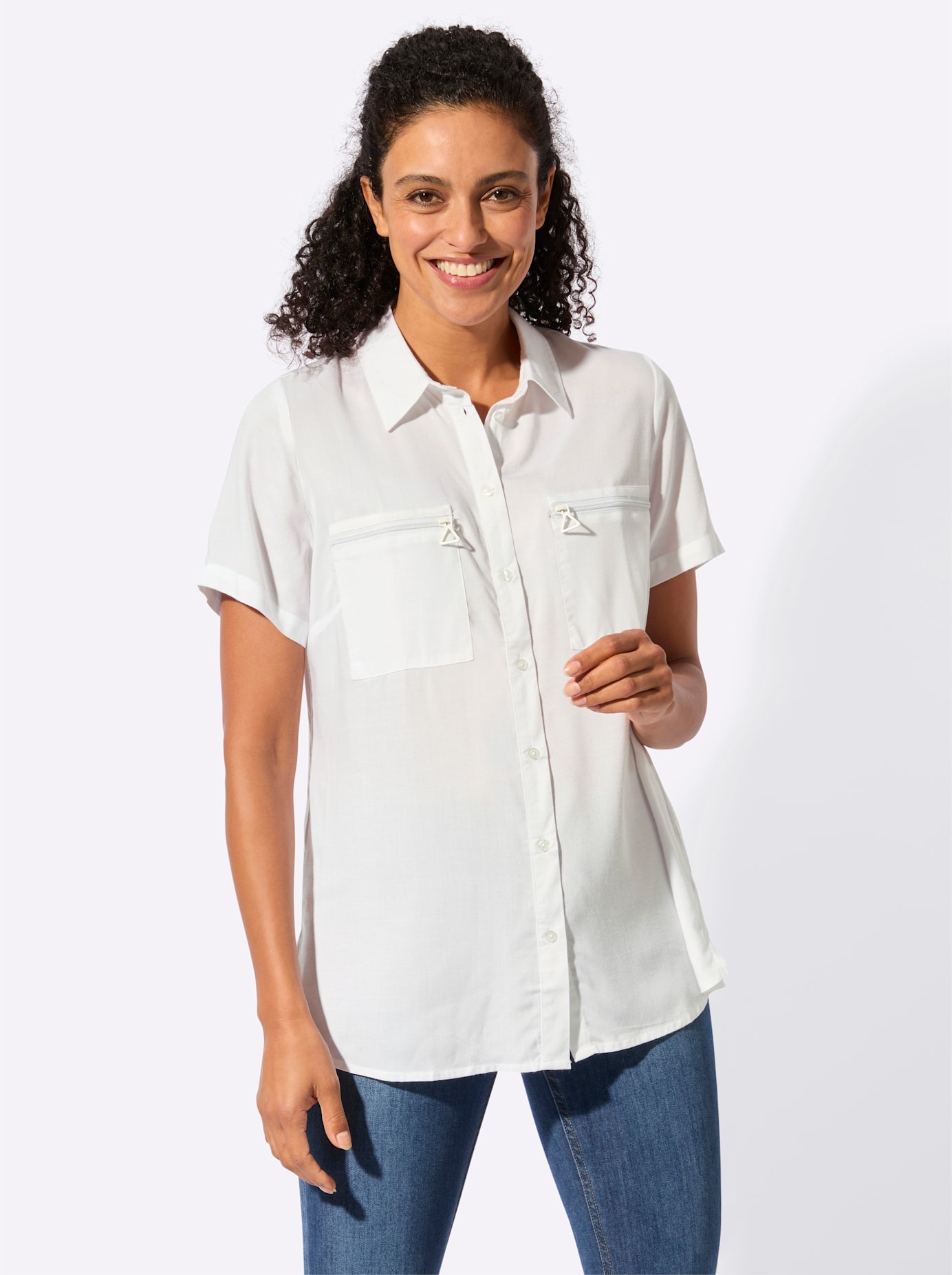 Der Hingucker bei dieser geschmeidig fliessenden Longbluse sind die aufgesetzten Brusttaschen mit Reissverschluss und dekorativem Zipper. Mit Hemdkragen, durchgehender Knopfleiste und kurzen Ärmeln. Weite gebende Falte an der Rückenpasse. Leicht abgerundeter Saum mit langen Seitenschlitzen. Viskose in ECOVERO-Qualität von Lenzing. 100% Viskose (ECOVERO). Maschinenwäsche.
