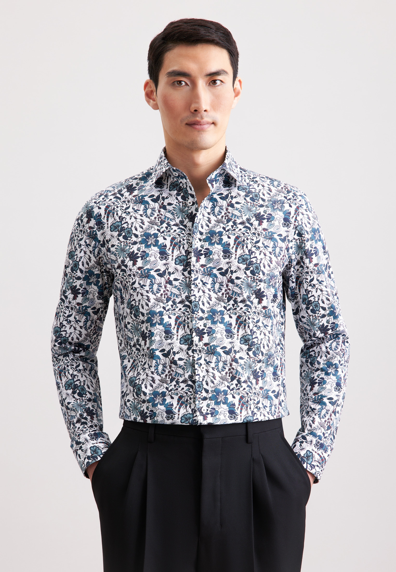 Maskuline Ästhetik: Das Business Hemd von Seidensticker aus der "SMART ESSENTIALS" Kollektion erweitert Ihre Garderobe um ein vielseitig einsetzbares Kleidungsstück. Es ist ein vielseitiger Klassiker, der sich ideal für Büro, Veranstaltungen, Freizeit oder Homeoffice eignet und überall überzeugt. Die Webart Popeline aus 100% Baumwolle ist mit hoher Dichte gewebt und daher extra widerstandsfähig, was sie optimal für pflegeleichte Business-Outfits macht. Durch seinen Schnitt in Regular fit liegt das Business Hemd weniger eng und eher leger an und bietet so einen optimalen Tragekomfort. Das schicke Druck-Muster ist eine stilvolle Ergänzung. Dieses Hemd verkörpert klassische Eleganz mit modernem Schliff. Stilsicher und elegant liegen Sie mit diesem Langarm-Business Hemd immer richtig. Weitenverstellbare Manschetten ergänzen das klassische Gesamtbild. Durch den Kentkragen wird der universelle Business-Charakter unterstrichen. Eine Brusttasche wirkt als unaufdringliches Detail.