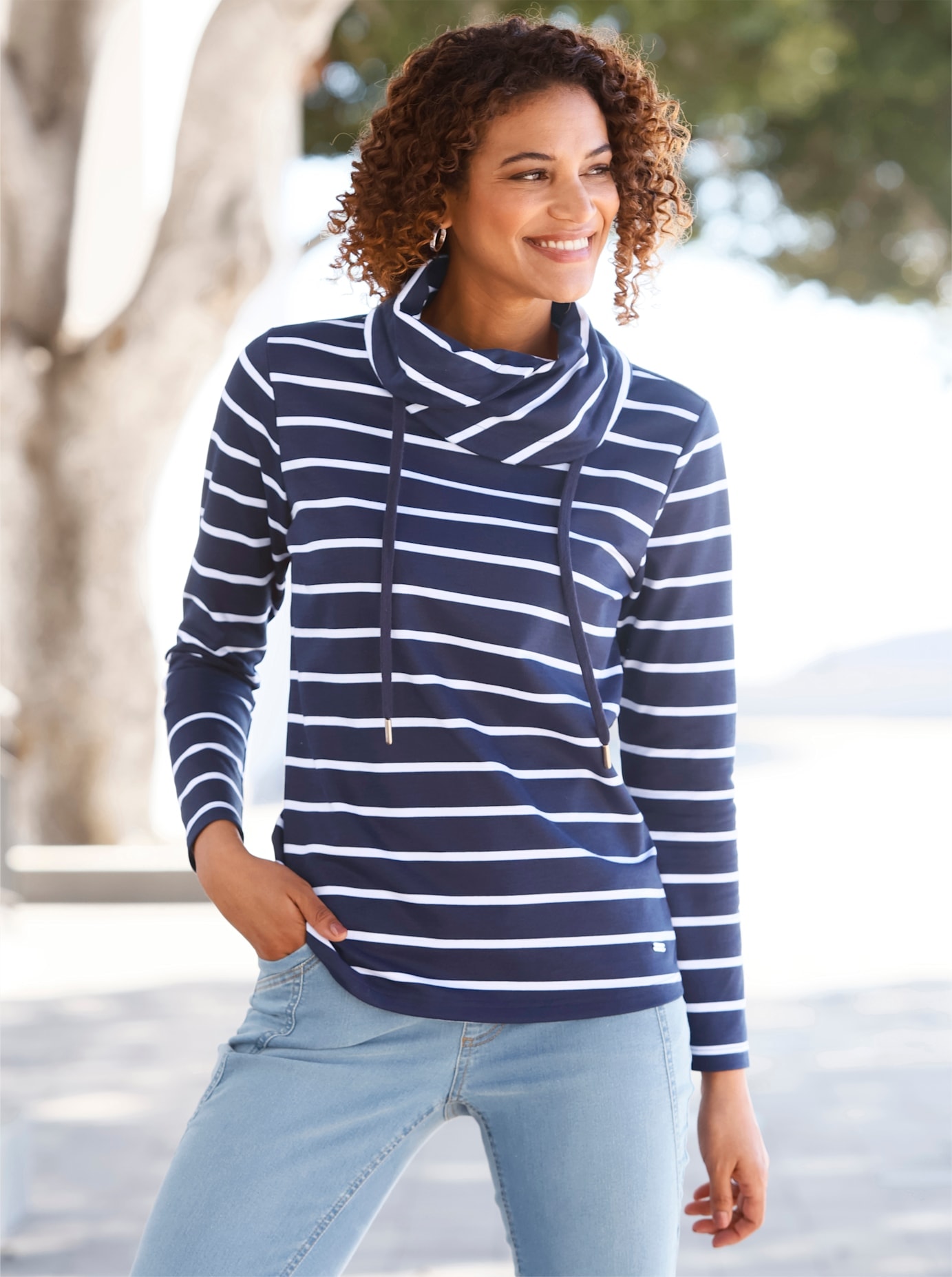 Lässig, modern, super bequem: dieses Sweatshirt begeistert gleich mehrfach! Denn der hohe, breite Stehkragen liegt voll im Trend und wird durch zwei gewebte Bindebänder mit Schriftzug zusätzlich aufgepeppt. Innen weich angeraut – so ist er herrlich weich und wärmend. Mit langen Ärmeln. Unterstützt die Initiative Cotton made in Africa. 50% Baumwolle, 50% Polyester. Maschinenwäsche.