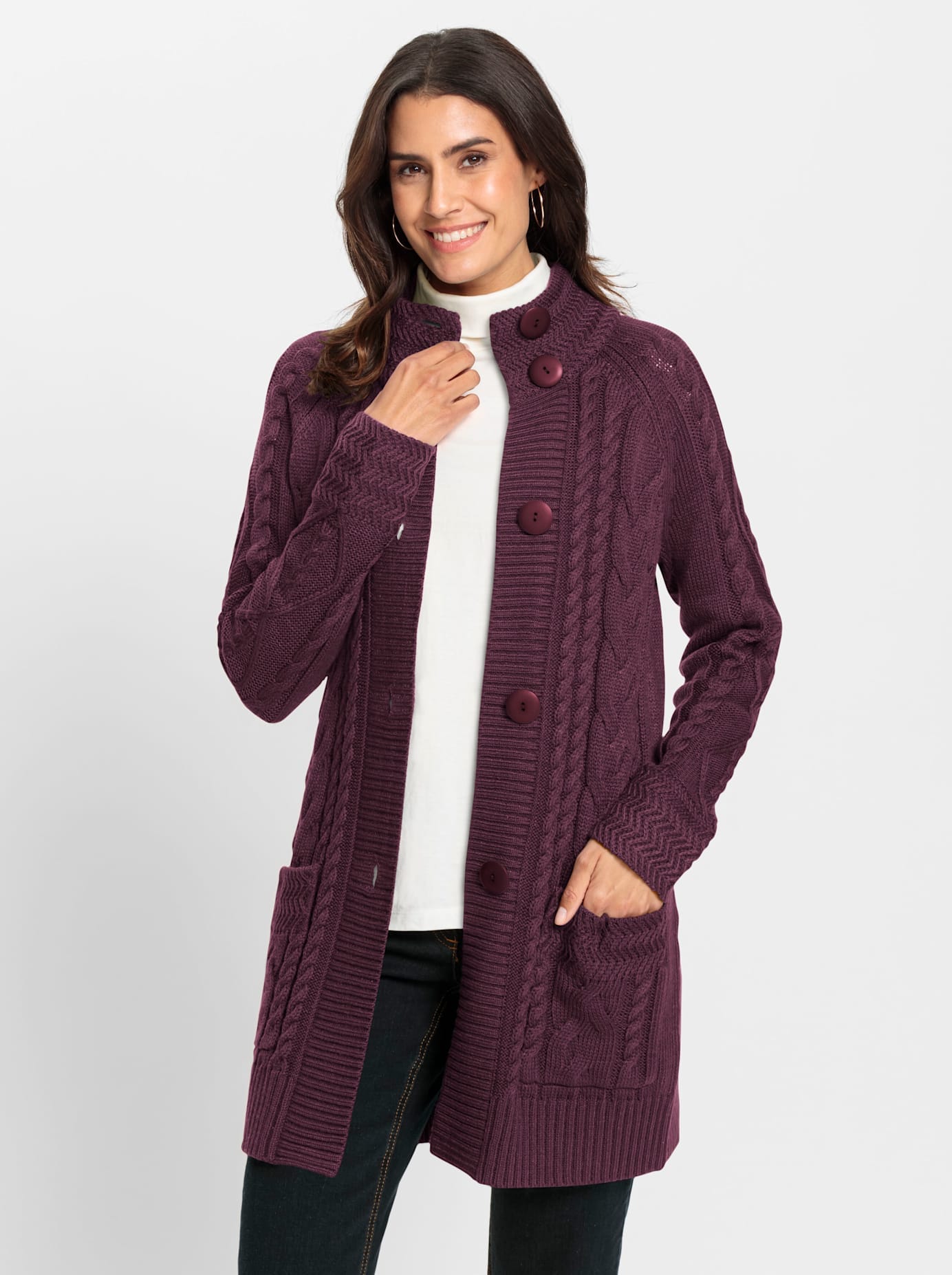 Kombistarke und pflegeleichte Strickjacke im trendigen Mix von Links- und Zopf-Strickmuster im Vorderteil und an den langen Raglan-Ärmeln. Der Stehkragen, die Knopfleiste sowie die Abschlüsse an den Ärmeln und am Saum sind gerippt. 2 praktische, aufgesetzte Taschen. Aufwendig in Form gestrickt. 100% Polyacryl. Maschinenwäsche.