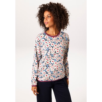 Sweatshirt von Aniston SELECTED mit malerischer Kirschblüten- und Landschaftsmalerei. Shirt mit Rundhalsausschnitt und langen Ärmeln, Tunnelzug seitlich am Saum. Aus bequemer, trageangenehmer Polyester-Qualität. In figurumspielender Form. Länge Gr. 36 ca. 62 cm. Maschinenwäsche.