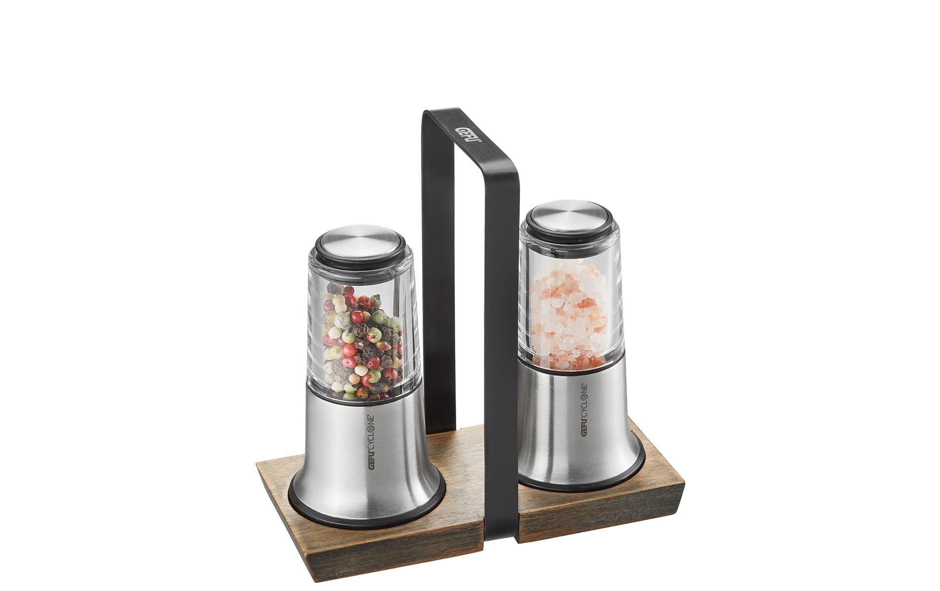 GEFU Salz- und Pfeffermühle X-Plosion. Enthält zwei Mühlen in Grösse S. Hochwertiges Keramik-Kegelmahlwerk CYCLONE für maximale Präzision und Effizienz. Luftdichter Deckel für optimalen Aroma- und Feuchtigkeitsschutz. Materialien: hochwertiger Edelstahl / Keramikmahlwerk / Akazienholz / Kunststoff / Silikon. Salz- und Pfeffermühlen-Set inklusive Menage aus Akazienholz. Stufenlose Mahlgradeinstellung: von pulverfein bis extragrob.