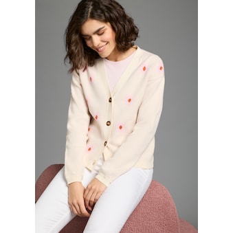 Es muss nicht immer ein Blumenstrauss sein! Beschenken Sie sich doch lieber mal selbst mit dieser Strickjacke mit eingestrickter, farbstarker Blume und Flower Power-Schriftzug im Vorder- und Rückteil. Im trendigen Oversize-Schnitt mit gerippten Abschlüssen am V-Ausschnitt, entlang der Knopfleiste und am Abschluss der langen Ärmel. Unterstützt die Initiative Cotton made in Africa. 50% Baumwolle, 50% Polyacryl. Maschinenwäsche.