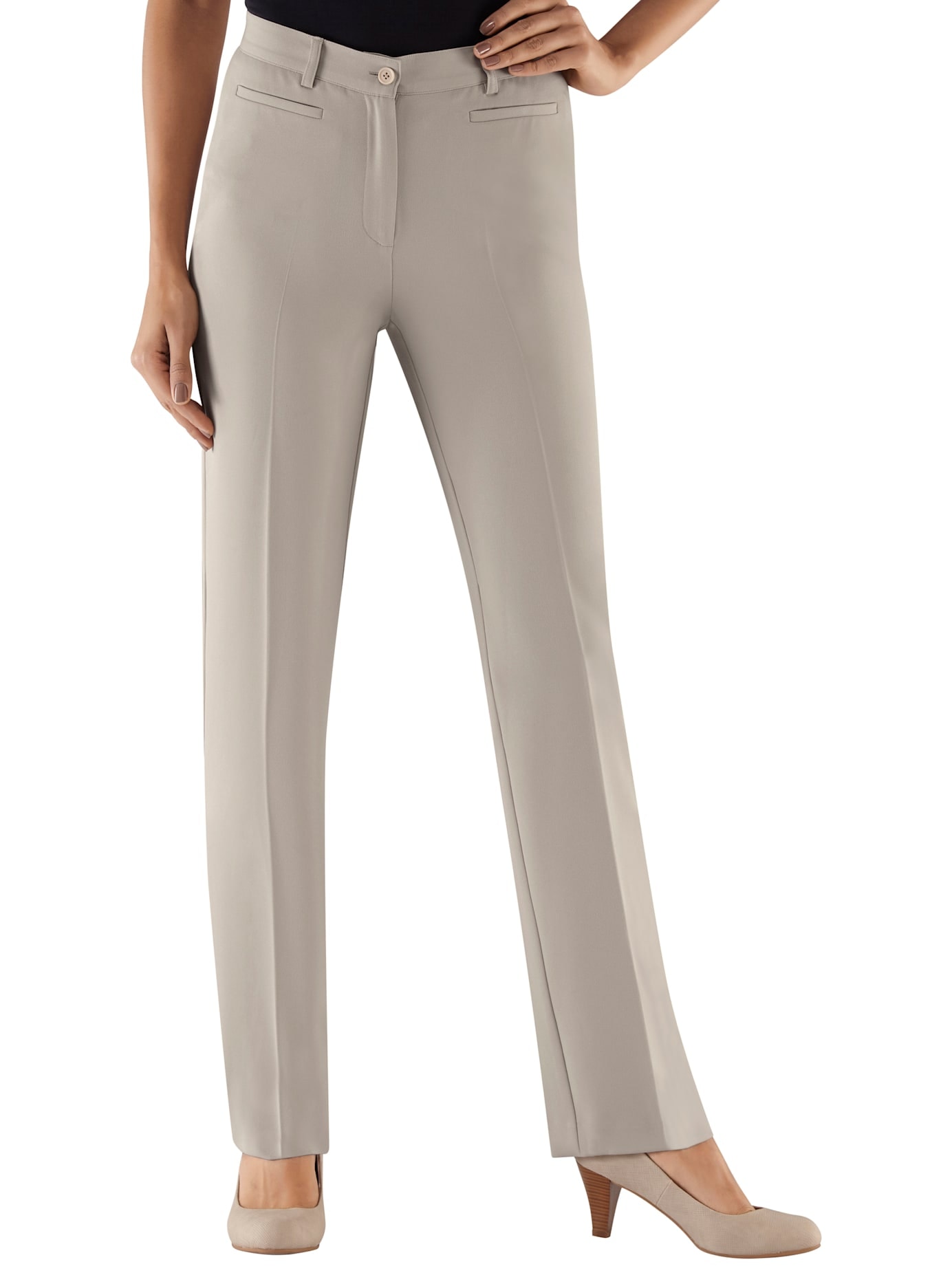 Wenn Eleganz auf Wohlfühl-Faktor trifft: Jersey-Hose mit edler Zierschnalle am Bund vorne mit dekorativen Steinchen. Rückwärtiger, komfortabler Dehnbund sowie 2 Taschen vorne. In bewegungselastischer Stretch-Qualität. 95% Polyester, 5% Elasthan. Maschinenwäsche.