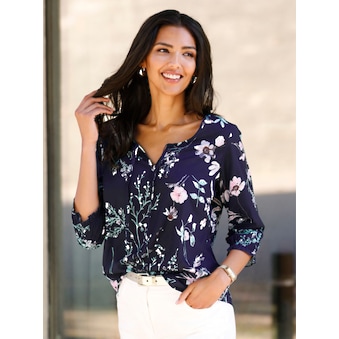 Luftige Druck-Tunika in leichter Crêpe-Qualität, die mit zartem Blütenmuster Blicke auf sich zieht. Rundhals-Ausschnitt und schmeichelnde Flügelärmel. Brustabnäher optimieren die Passform. 100% Polyester. Maschinenwäsche.