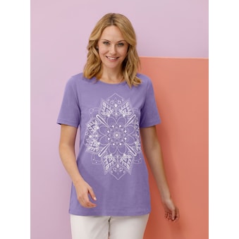 Blickfangstarkes Druck-Shirt dank des mehrfarbigen Grafikdessins und attraktiver Details, wie einem halsfernen Stehkragen mit kontrastfarbigen Bändern und aufgesetzter Applikation in Leder-Optik. Mit 3/4-Ärmeln. 100% Baumwolle. Maschinenwäsche.