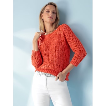Pullover Weich fallender, leicht transparenter Feinstrick, im Linksstrick mit Effektgarn verarbeitet. Mit Rundhals-Ausschnitt, überschnittener Schulter und Kurzarm. Modische Rollbündchen, Seitenschlitze. 100% Polyacryl. Maschinenwäsche.