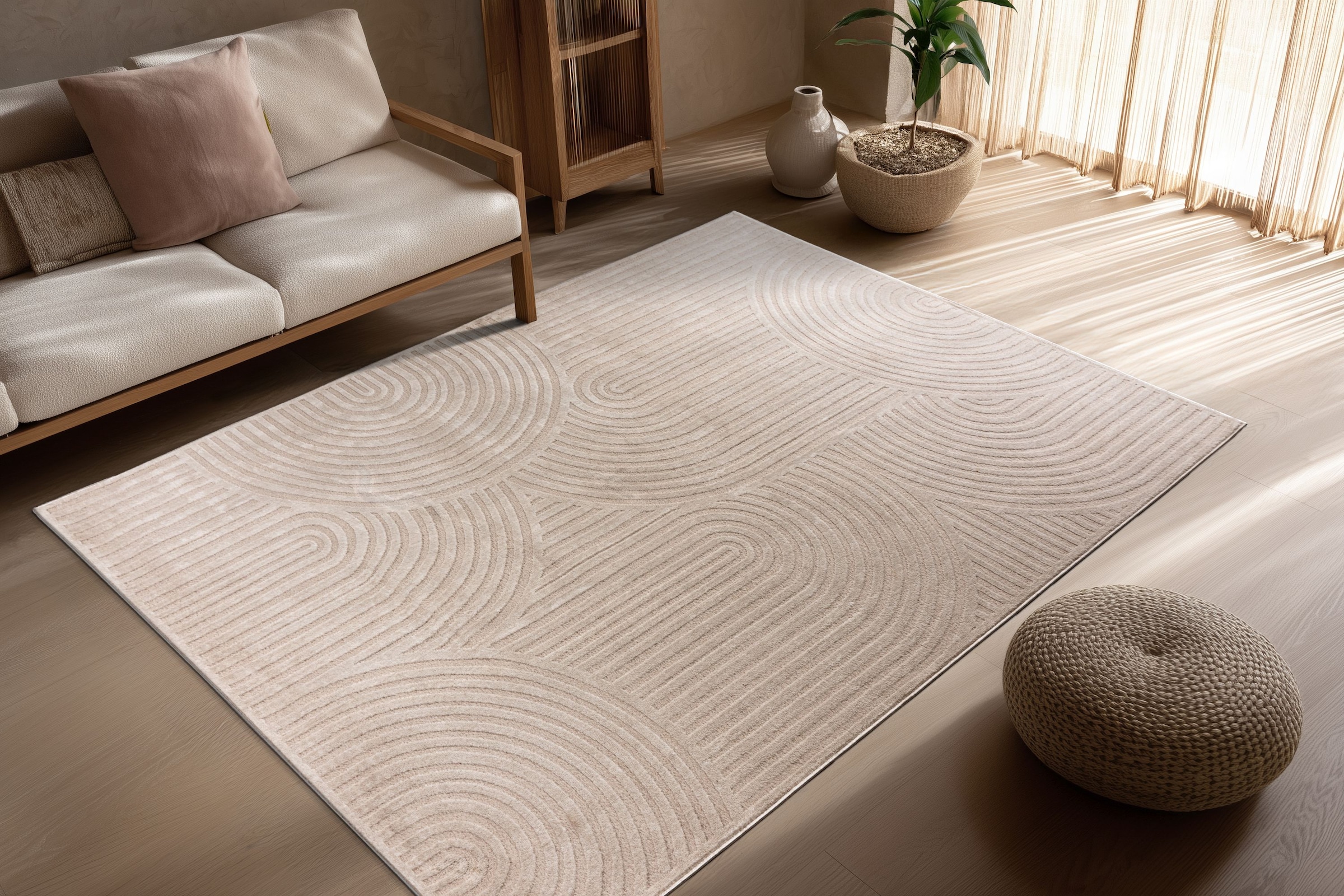 Tapis tufté à la machine | Beim Auslegen des Teppichs kann durch das Aufrollen der Teppich etwas wellig erscheinen, dieses legt sich nach kurzer Zeit aus. Sie können dieses etwas beschleunigen wenn Sie den Artikel in gegenläufiger Richtung nochmals aufwickeln. |