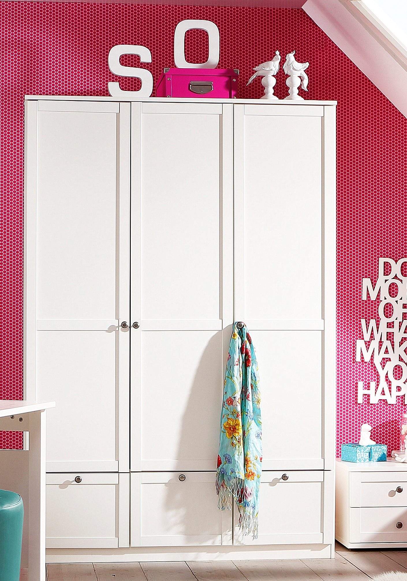 Faits intéressants | Tolles Jugendzimmerprogramm in Weiss mit dekorativen Aufleistungen. Pflegeleichte Kunststoffoberfläche. Innendekor Leinen grau. Beschläge aus Metall. Griffe aus Metall. Schubkästen auf Metalllaufleisten. Mit 2 Schubkästen (Innenmasse, B/T/H: 40/30/8 cm). Gesamtmasse (B/T/H): 46/40/38 cm. Alles ca.-Masse. Mit Aufbauanleitung. |