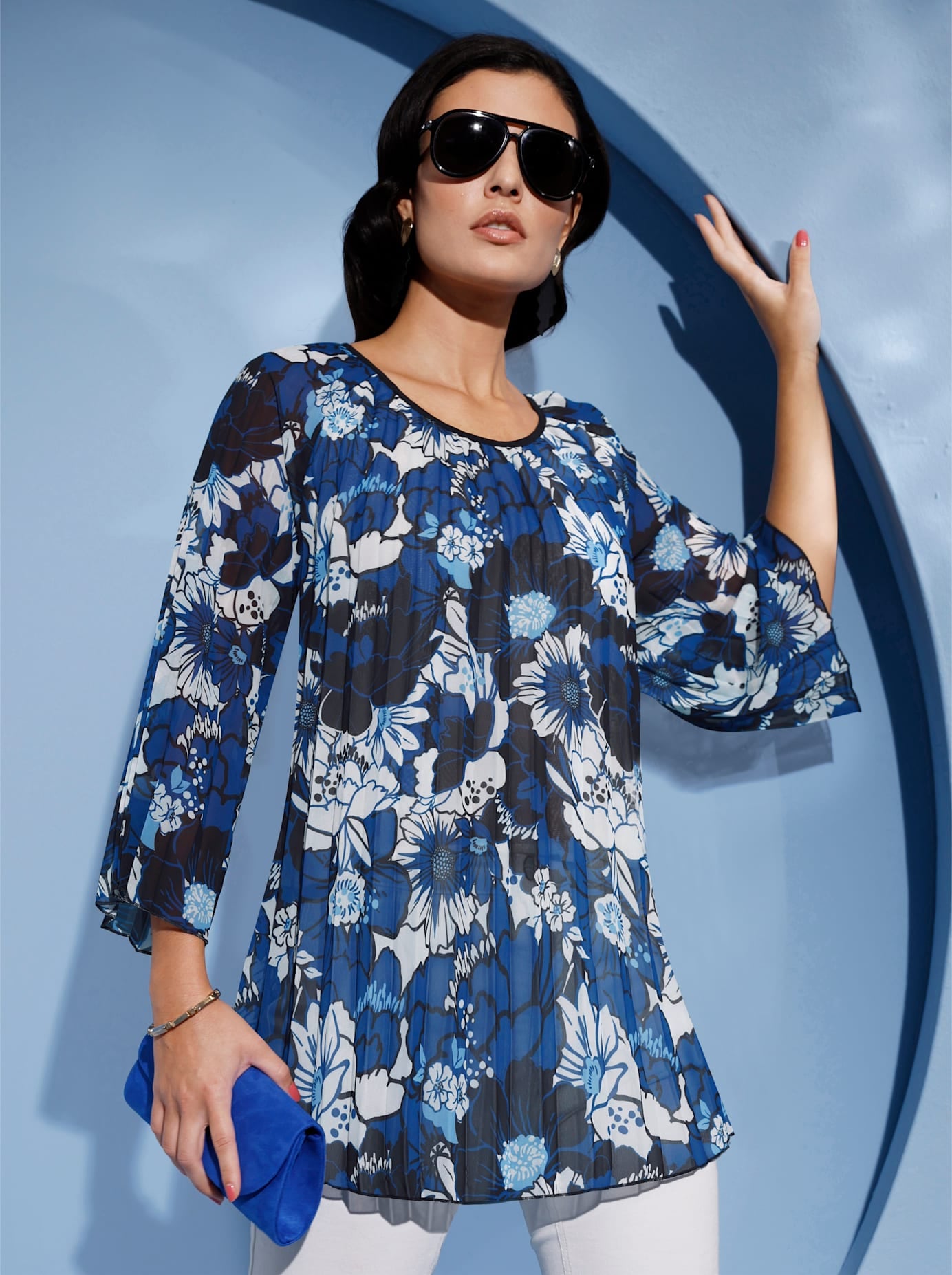 Tunika mit paspeliertem Rundhals-Ausschnitt, Bindeband und Seitenschlitzen. Brustabnäher sorgen für optimalen Sitz. Transparente Qualität. 100% Polyester. Maschinenwäsche.