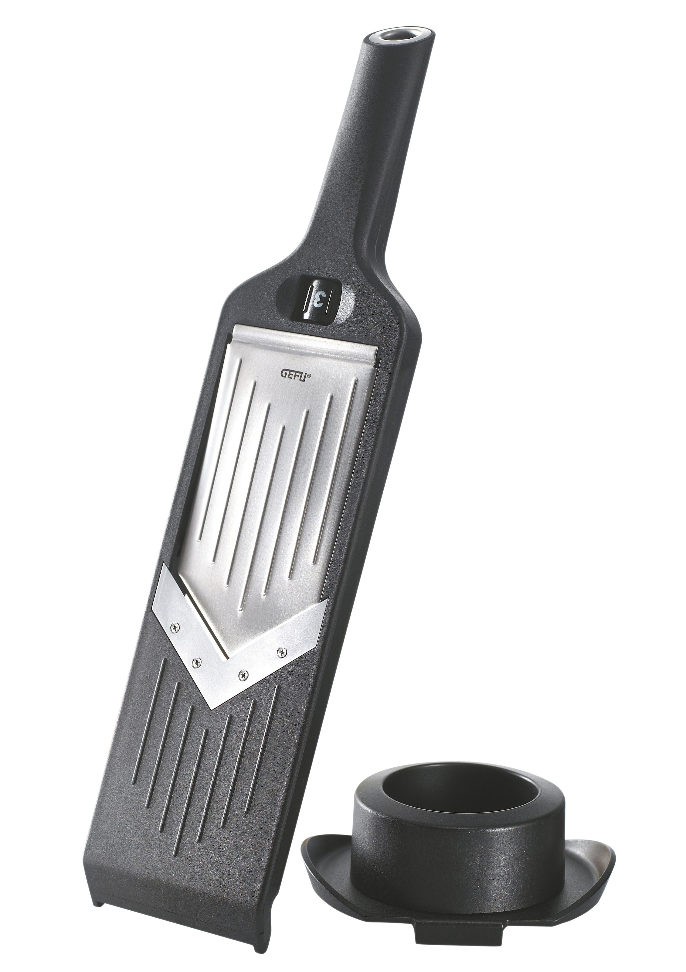 GEFU Gemüse-Hobel, »VIOLI«. Handlich durch die kompakte Grösse, ist der V-Hobel »VIOLI« mit den einfach einstellbaren 5 Schnittstärken, der perfekte Küchenpartner für jeden Tag. Schick, schwarz, scharf: Der kompakte Gemüse-Hobel »VIOLI« sorgt im Nu für gleichmässige Gemüse- oder Obstscheiben. 5 Schnittstärken von 1 bis 5 mm sind einstellbar - und wir der Hobel nicht benutzt, besteht durch die Sicherheitseinstellung keine Verletzungsgefahr. Rutschfeste Füsse geben dem Hobel aus ABS-Kunststoff festen Halt. Und die durchdachten Einkerbungen am spülmaschinengeeigneten Hobel fixieren den Küchenhelfer auf Schüssel- oder Topfrändern.