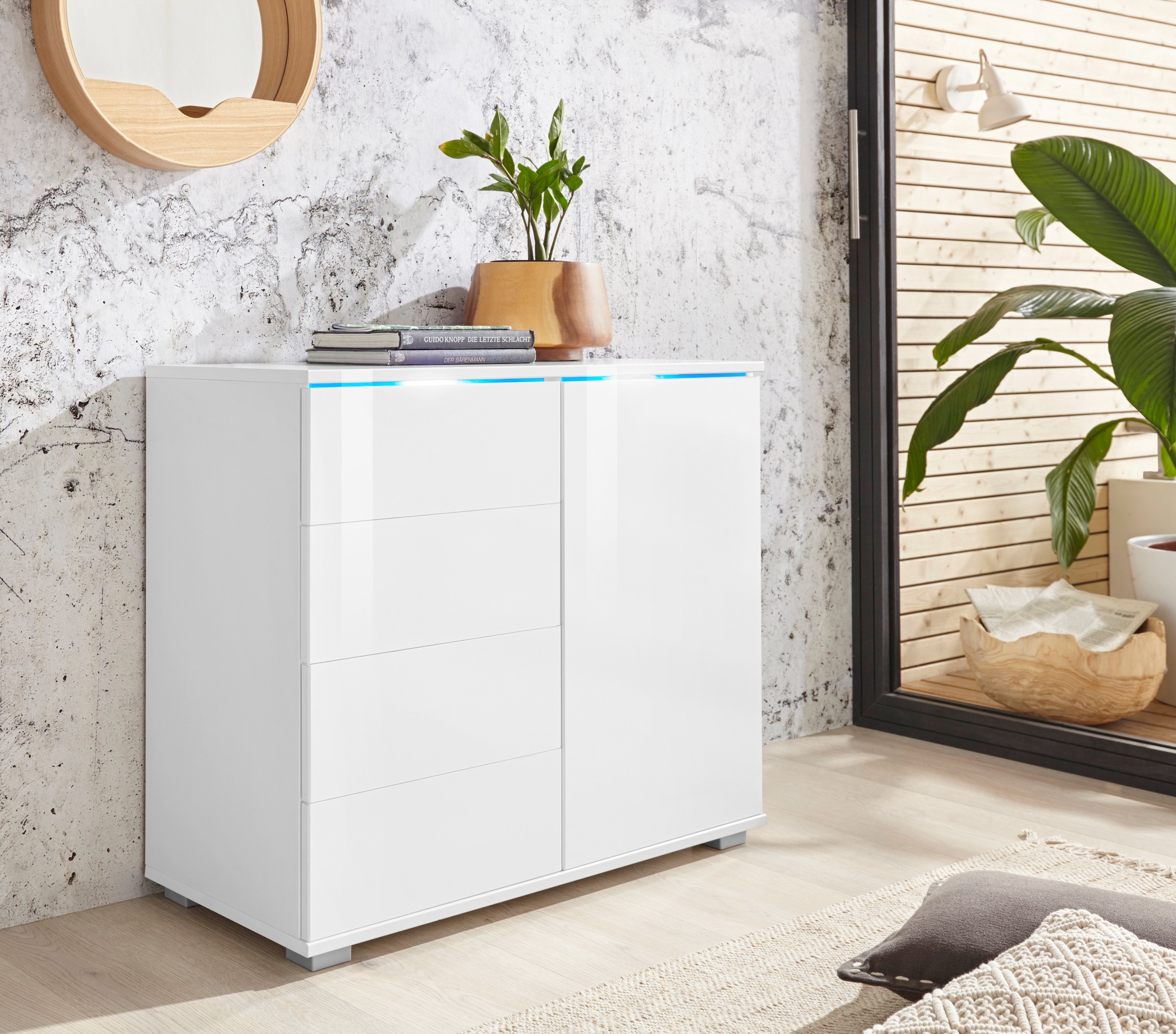 Faits intéressants | Kommoden und Nachttische mit »Push to open« Funktion für eine elegante Optik ohne Griff. Raffinierte LED-Beleuchtung unter dem Oberboden. Kugelgelagerte Schubkastenführungen und Beschläge aus Metall. |