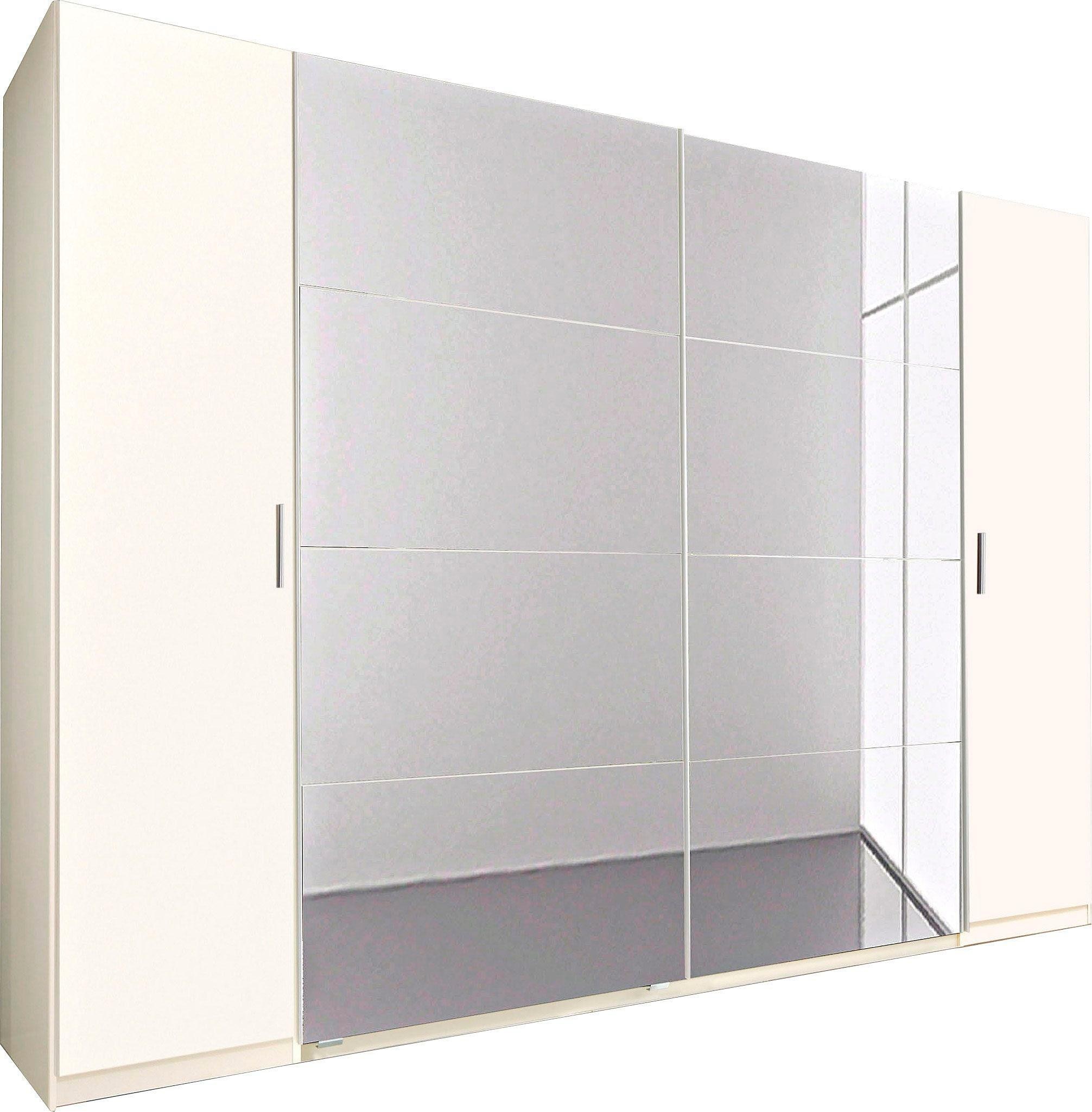 Faits intéressants | Toller Dreh-/Schwebetürenschrank, aussen 2 Drehtüren mit weisser Hochglanz-Oberfläche und in der Mitte 2 Schwebetüren mit Spiegelauflagen. Pflegeleichte Kunststoffoberfläche. Griffleisten aus Metall. Alufarbene Kunststoffgriffe auf den Aussentüren. Beschläge, Scharniere und Kleiderstangen aus Metall.;Inneneinteilung siehe Piktogramme;Drehtürengriffe: Kunststoff, alufarben Griffleisten: Metall |
