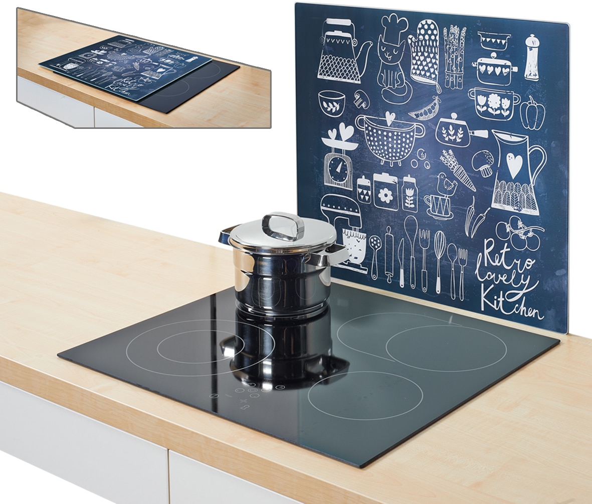 Zeller Present Herdblende-/Abdeckplatte »Lovely Kitchen«, 56 x 50 cm. Diese moderne Herdabdeckplatte aus hochwertigem Glas überzeugt nicht nur durch Ihre Funktionalität, sondern auch durch Ihre Optik. Sie wird zum Hingucker in Ihrem Haushalt. Die praktische Platte stellt Ihnen zusätzlichen Arbeitsplatz zur Verfügung und kann zum Abdecken von Kochfeld und Spüle oder als Spritzschutz hinter dem Herd genutzt werden. Ebenso eignet Sie sich zum Schneiden, Vorbereiten und Servieren. Sie ist nahezu unzerbrechlich und hitzebeständig. Trotzdem empfehlen wir Ihnen, die Blende nur auf abgekühlten Kochfeldern zu verwenden. Der elegante Haushaltshelfer ist hygienisch und äusserst schnittfest. Er wird mit rutschfesten Silikonfüssen und Klettaufklebern zur Wandbefestigung geliefert. Material: Glas. Masse: ca. 56 x 50 x 0,8 cm.
