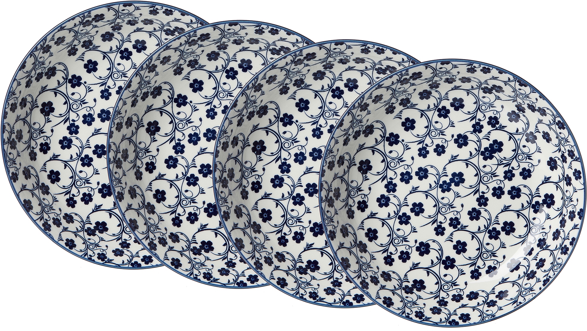 Ritzenhoff & Breker Suppenteller, Ø 20,5 cm, Keramik, 4 Teile, »ROYAL SAKURA«. Die Geschirrserie »Royal« erobert als zeitgemäss stylische Adaption traditioneller japanischer Reisschalen-Dekore nicht nur die Herzen trendbewusster Kosmopoliten. Das Dessin »Sakura«, bei dem sich florale Ornamente aus zierlichen Blüten und Blättern liebevoll über die Geschirrteile ranken, erinnert an die japanische Kirschblüte. Damit hat zwar jede der drei royalblauen Dessinvarianten »Sakura«, »Makoto« und »Reiko« der Serie »Royal« seinen ganz individuellen Charakter, im gemeinsamen Mix & Match bieten sie aber dennoch einen ausgesprochen harmonischen Anblick im typischen »Land des Lächelns«-Look. Ein besonderer Reiz liegt darin, dass die Dekore bei allen Geschirrteilen vollflächig aufgebracht sind, damit die schönen Dessins richtig zur Geltung können. Set bestehend aus: 4 Suppenteller, ca. 20,5 cm Durchmesser und 4,5 cm hoch. Material: Keramik. Spülmaschinen- und mikrowellengeeignet.;