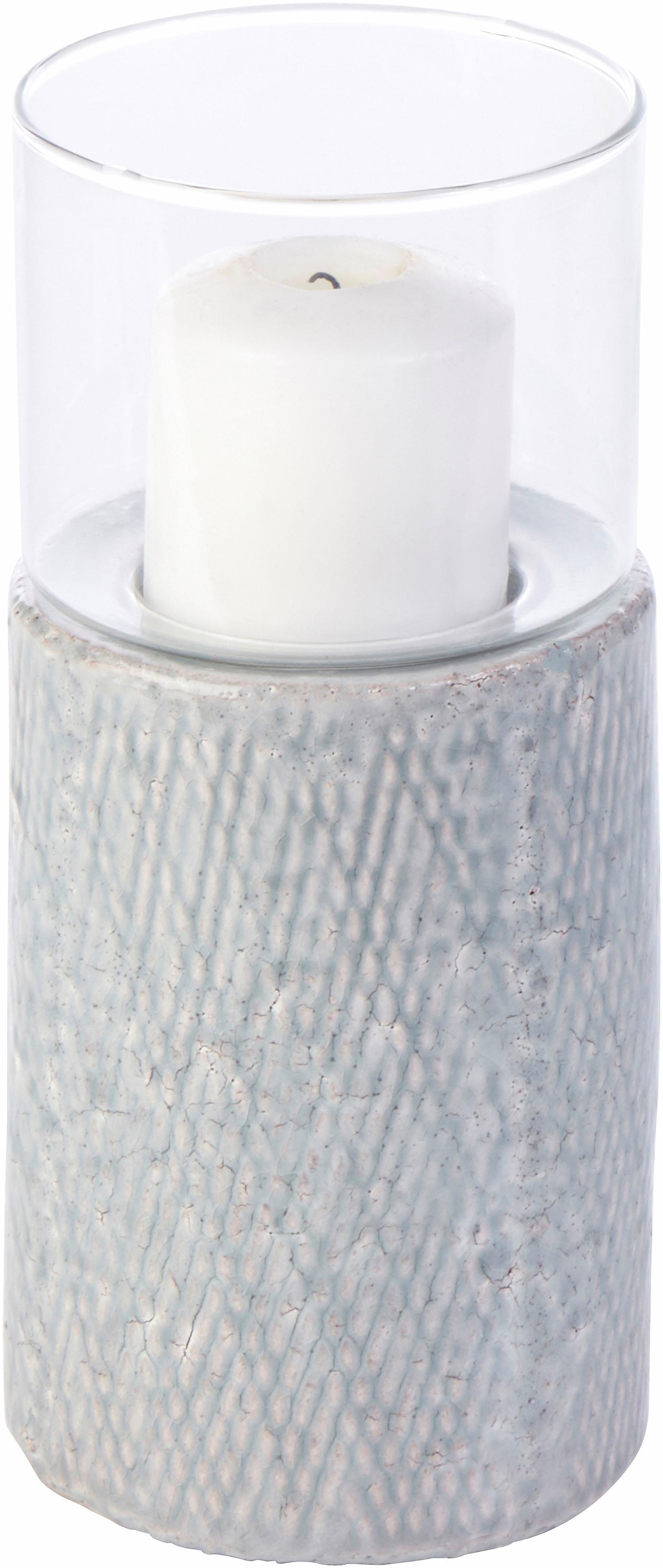 Als dekorative Gestaltungsidee mit vielseitigen Aufstellmöglichkeiten entpuppt sich dieses attraktive Windlicht von Home affaire. Das zylinderförmige Glas sitzt auf einem Sockel aus robustem Steingut mit gut sichtbarer Struktur. Es entfaltet eine charmante Wirkung auf dem Wohnzimmertisch, auf der Fensterbank und an vielen weiteren Stellen. Dank der schweren Bauweise eignet sich das Standwindlicht prima auch für den Aussenbereich. Ob einzeln oder im Ensemble aufgestellt, es entsteht eine romantische Stimmung auf dem Balkon, auf der Terrasse und im Garten. Ein toller Anblick an lauen Sommerabenden, wenn die Sonne hinter dem Horizont verschwindet. Das dekorative Windlicht von Home affaire eröffnet zahlreiche Gestaltungsmöglichkeiten für den Innen- und Aussenbereich.