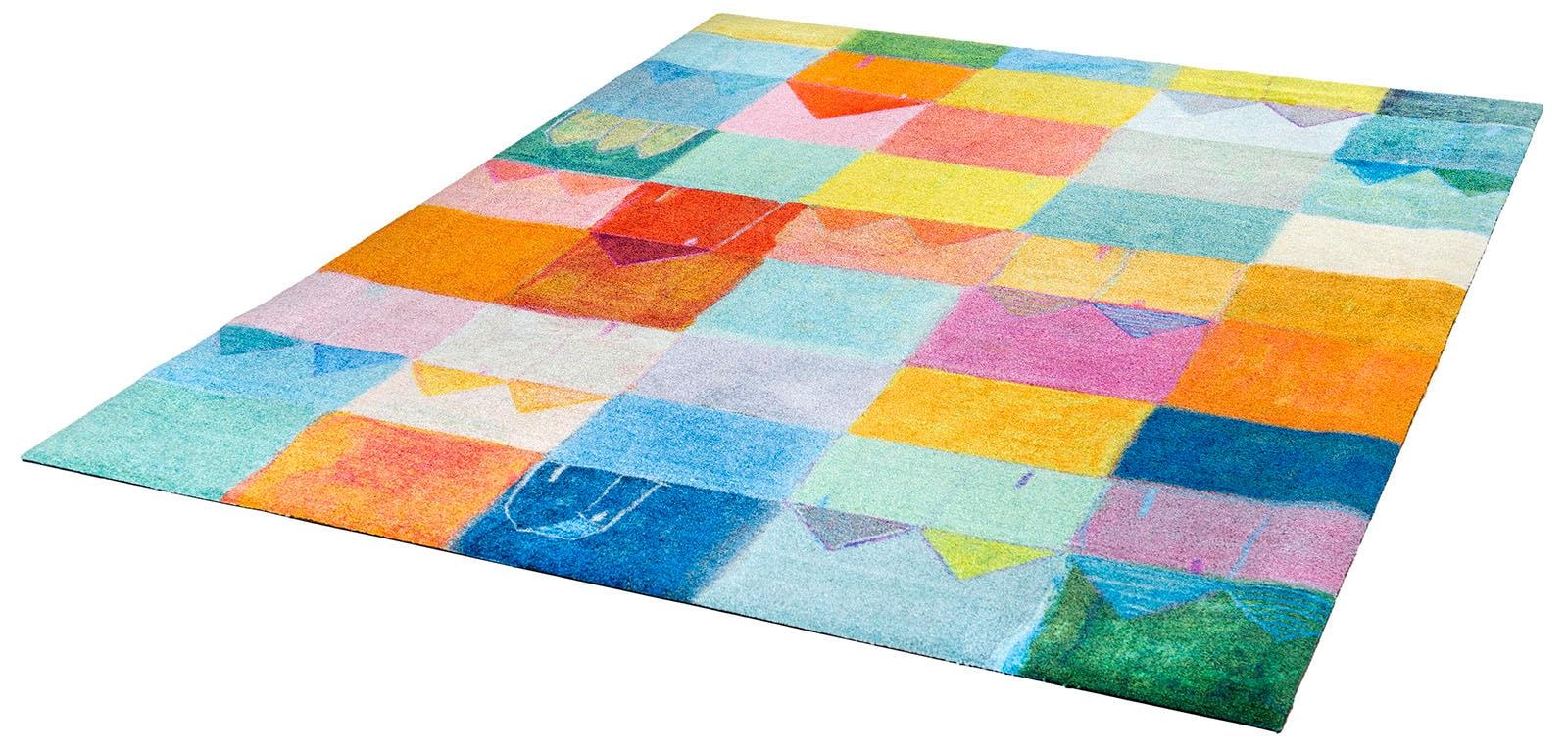 Der Teppich mit Funktion. Die randlose Teppichmatte aus der DECOR Produktlinie von wash+dry by Kleen-Tex vereint die hygienischen Funktionen einer Fussmatte mit den optischen Ansprüchen eines Teppichs. Die Matte „Sonnenstadt“ begeistert durch ihre fröhlich frische Farbgestaltung und bringt im wahrsten Sinn Sonne in jeden Wohnraum. Das Design des Teppichs stammt vom Künstler Eugen Stross, der für seine farbintensiven Zeichnungen bekannt ist. Neben dem dekorativen Aspekt kommt bei allen wash+dry Matten und Läufern die Funktion nicht zu kurz. Zuverlässig nimmt der flache, dichte Flor aus Polyamid Schmutz und Feuchtigkeit auch in hoch frequentierten Bereichen auf. Die rutschhemmende Rückenbeschichtung aus Nitrilgummi sorgt für sicheren Stand. Aufgrund von Farbechtheit und Formstabilität kann die Matte einfach in der Waschmaschine und auch im Trockner gereinigt werden, um die jahrelange Freude an der Matte zu gewährleisten. Der Teppich ist 100% PVC-frei.