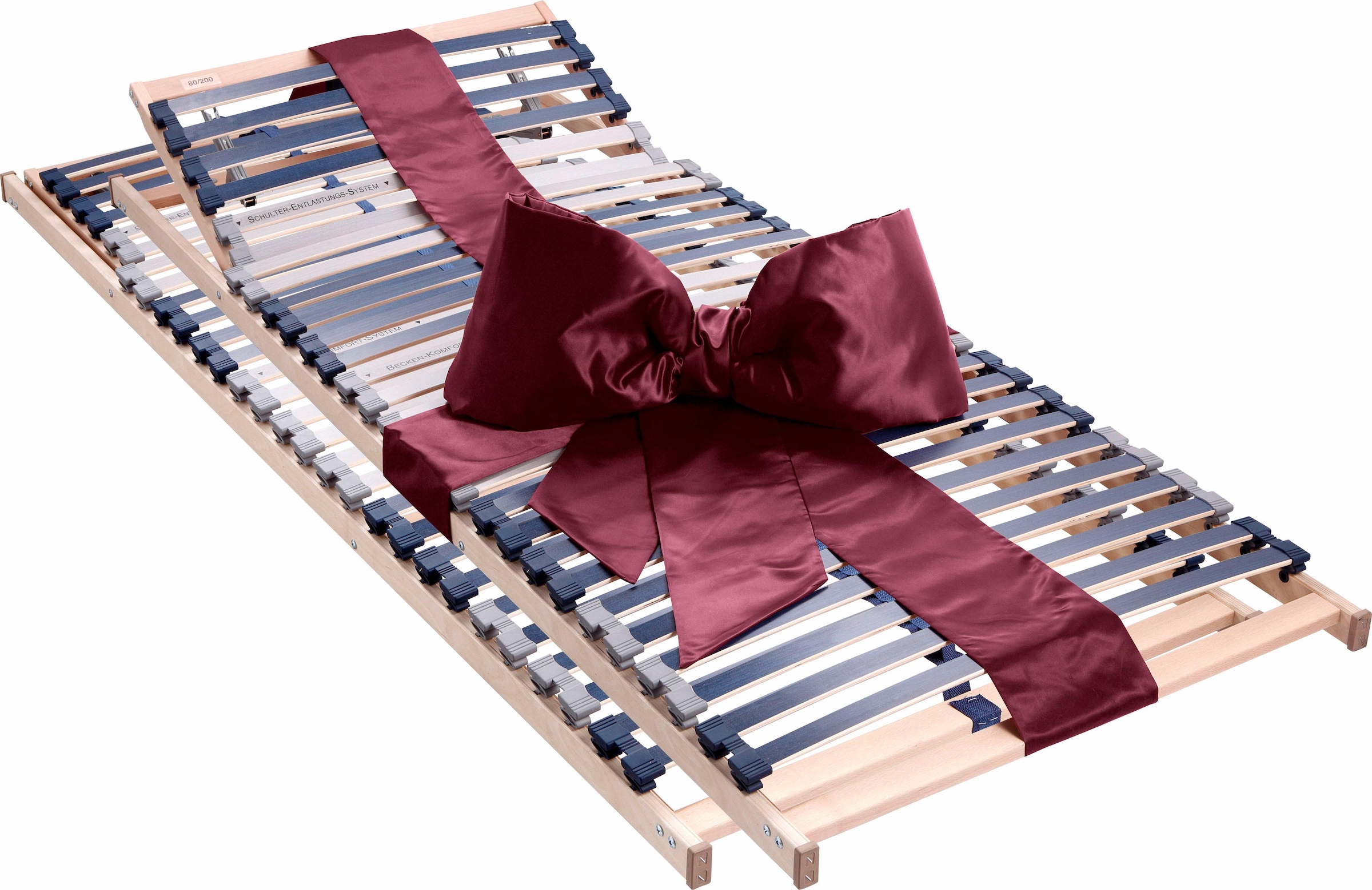 Lattenrost >Dura Flex< im Doppelpack mit spezieller Schulter- und Beckenzone. Lagerung der 28 elastischen und langlebigen Federholzleisten in holmaufliegenden, flexiblen Duo-Kappen aus Kautschuk. Damit ideal für Doppelbetten geeignet. Die Federleisten sind für einen besseren Feuchtigkeitsschutz der Hölzer speziell beschichtet bzw. ummantelt. Mit Mittelgurt zur besseren Druckverteilung und Stabilisierung. Langlebig und stabil durch die Verwendung hochwertiger Materialien und mehrfach-furniertem Schichtholz. Kopfteil nach den persönlichen Wünschen mehrfach manuell verstellbar. Made in Germany.