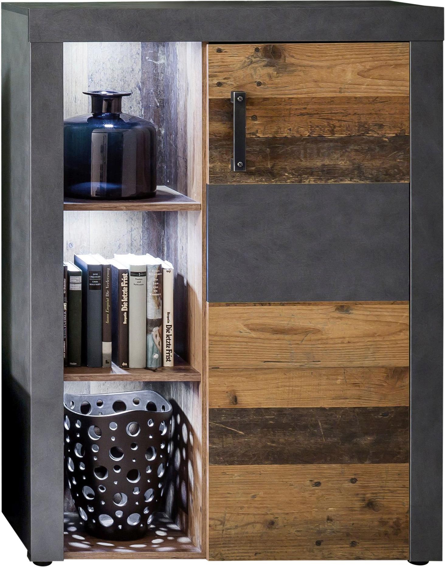 - Wohnzimmerschrank, Masse 87 cm Breite, 34 cm Tiefe, 118 cm Höhe. Bietet flexible und übersichtliche Ordnung hinter 1 Tür & in 3 offenen Fächern