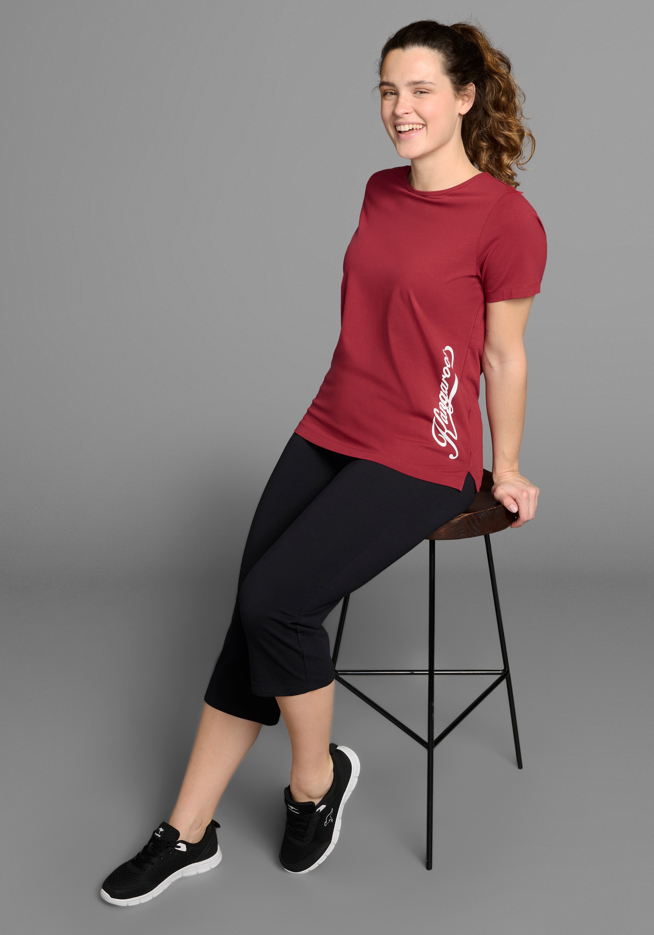 Kombistarkes Damen-T-Shirt der Marke KangaROOS. Mit einem hüftbedeckenden und figurumspielenden Schnitt. Es ist mit einem modischen Logodruck versehen. Das Oberteil ist angenehm auf der Haut dank der weichen Baumwolle.