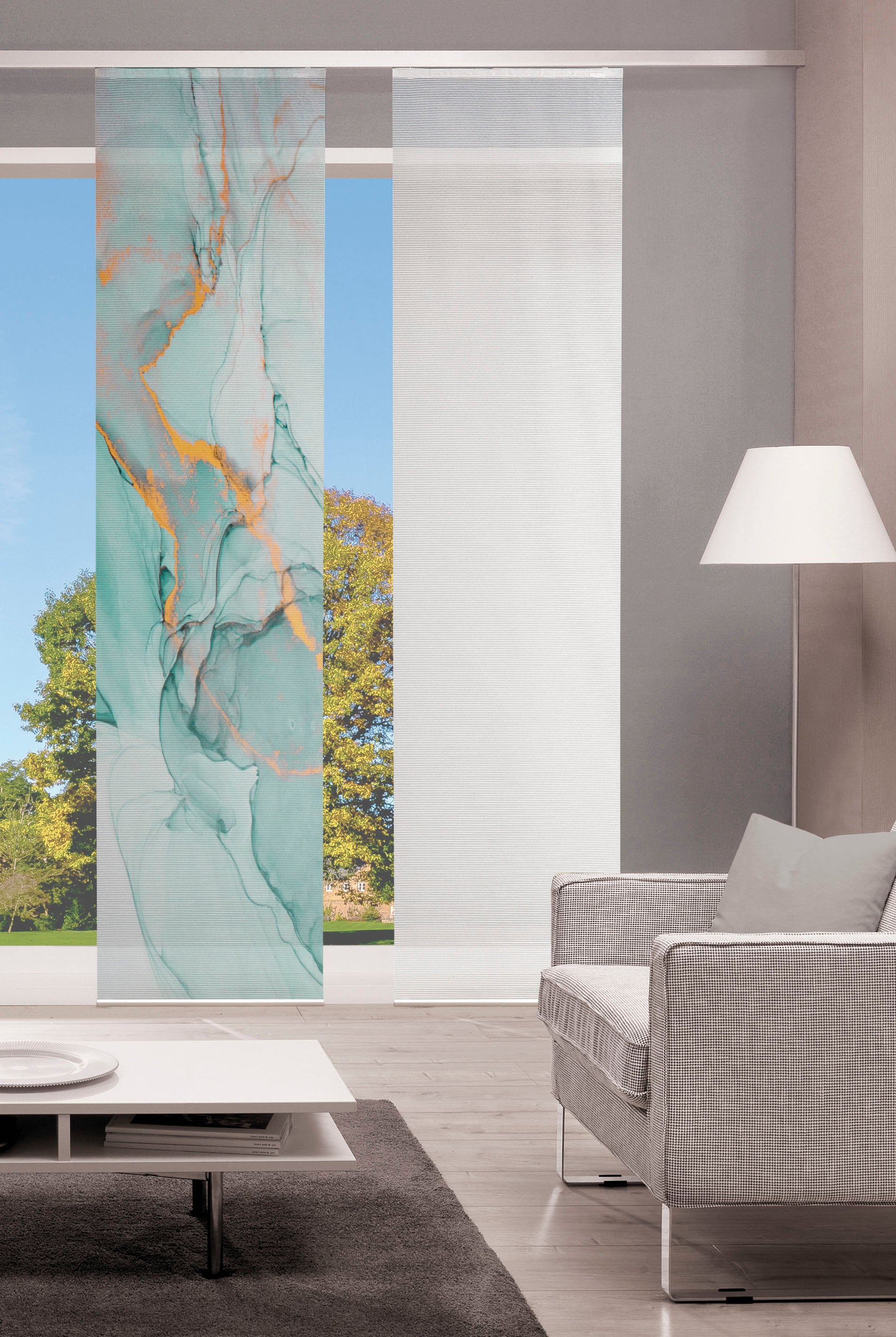 Dieser Schiebevorhang mit dem digitalen Fotodruck "MARMOSA" ergibt durch das fotorealistische Motiv einen tollen Effekt an Ihren Fenstern. Der Schiebevorhang wurde digital bedruckt und zeigt so seine Brillanz auf dem HALBTRANSPARENTEM STOFF in BAMBUS-OPTIK mit leichten QUEREFFEKTEN. Die Seiten wurden durch spezielle Lasertechnik geschnitten. Inkl. Paneelwagen mit Röllchen und X-Gleitern für alle gängigen Gardinenschienen. Durch die hochwertige Aluminium-Klemmleiste haben Sie die Möglichkeit den Schiebevorhang auf jede beliebige Höhe zu kürzen. Material: 100% Polyester. Dieser Schiebevorhang lässt sich sehr gut mit weiteren Schiebegardinen kombinieren.