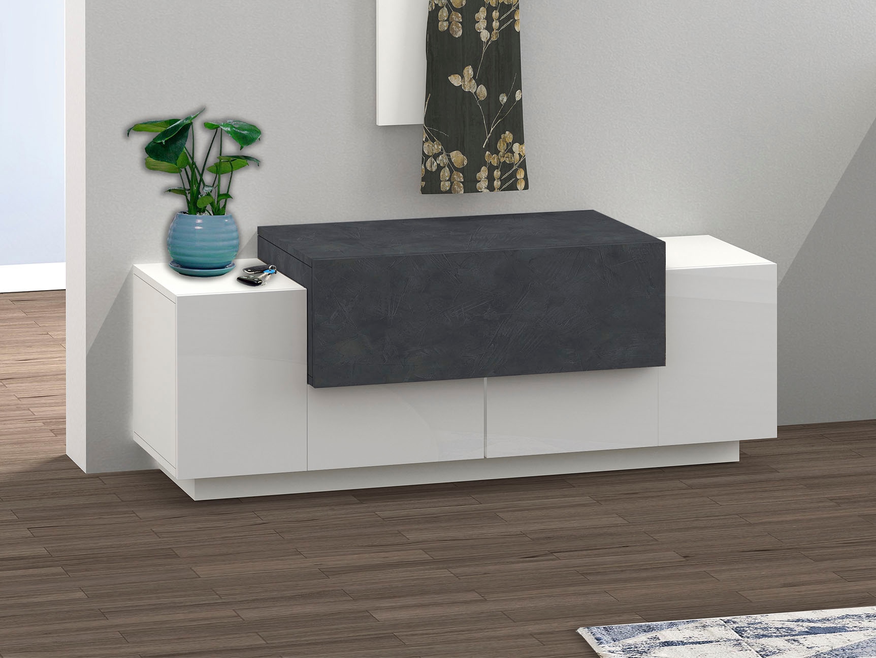 Wissenswertes | Schuhbank mit 1 Klappe mittig und 2 seitlichen Hochglanz-Türen |