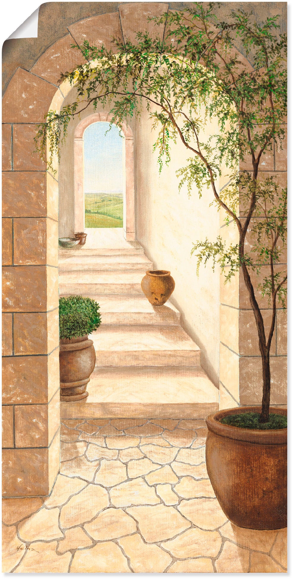 Unser mit Liebe in Handarbeit hergestelltes Wandbild mit dem Motiv Toskanischer Durchgang von A. Heins überzeugt durch originalgetreue Druckqualität und hochwertige Basismaterialen. Das Motiv wird Dir wie abgebildet und fertig zum Aufhängen nach Hause geliefert.