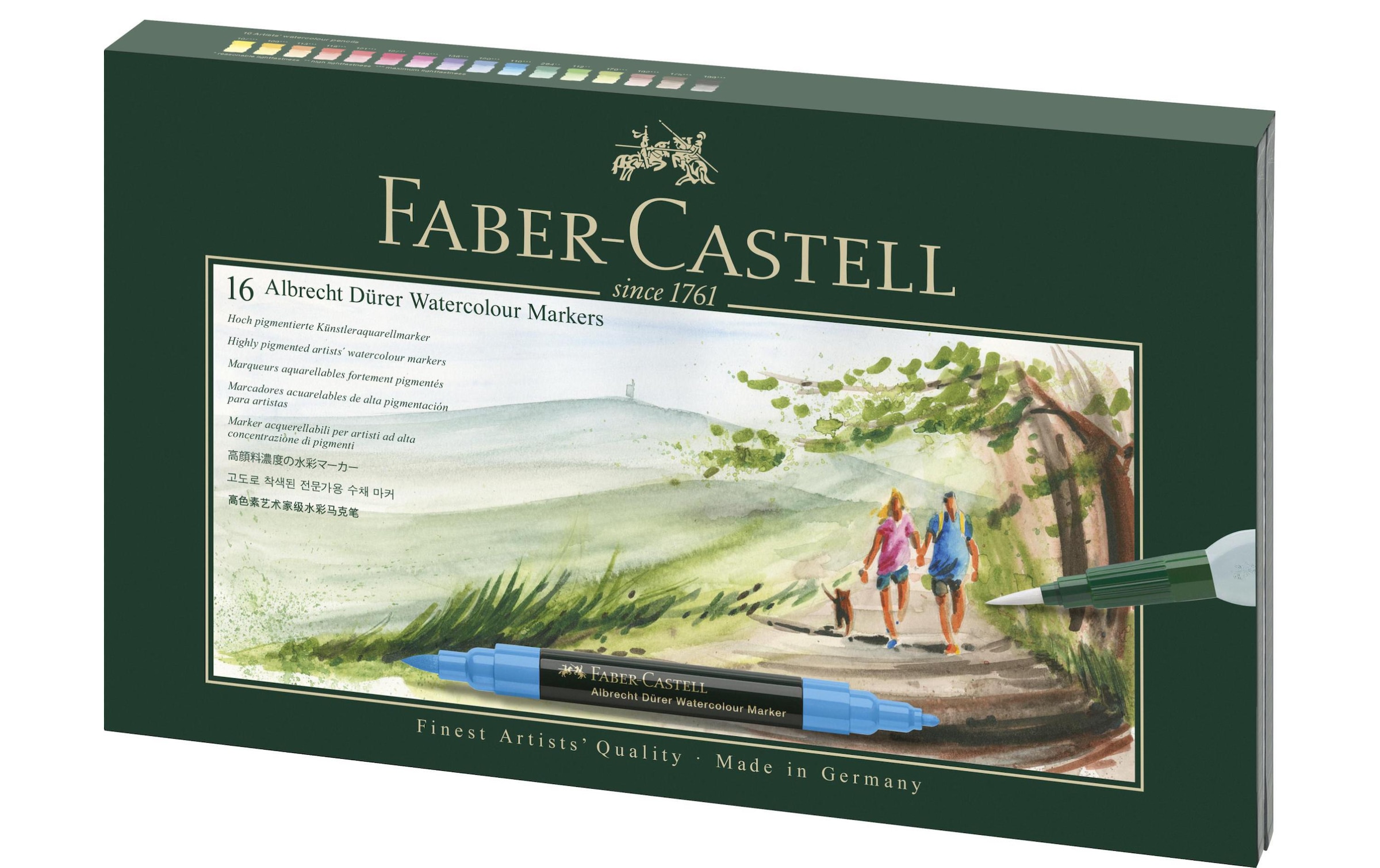 Faber Castell Albrecht Dürer Set mit 16 Aquarell-Filzstiften Aquarellstifte für Künstler sind die moderne Version der Aquarellmalerei: ein hochwertiges Zeichengerät, das spontanes Skizzieren und künstlerisches Aquarellmalen erleichtert, Die Tinte auf Wasserbasis ist immer gebrauchsfertig und kann auch vollständig mit Wasser gemischt werden, Die Vielseitigkeit dieser Stifte überzeugt vor allem auf Reisen, Diejenigen, die sich gerne an die Eindrücke ihrer Reise erinnern möchten, werden sich freuen, diese Marker verwenden zu können,