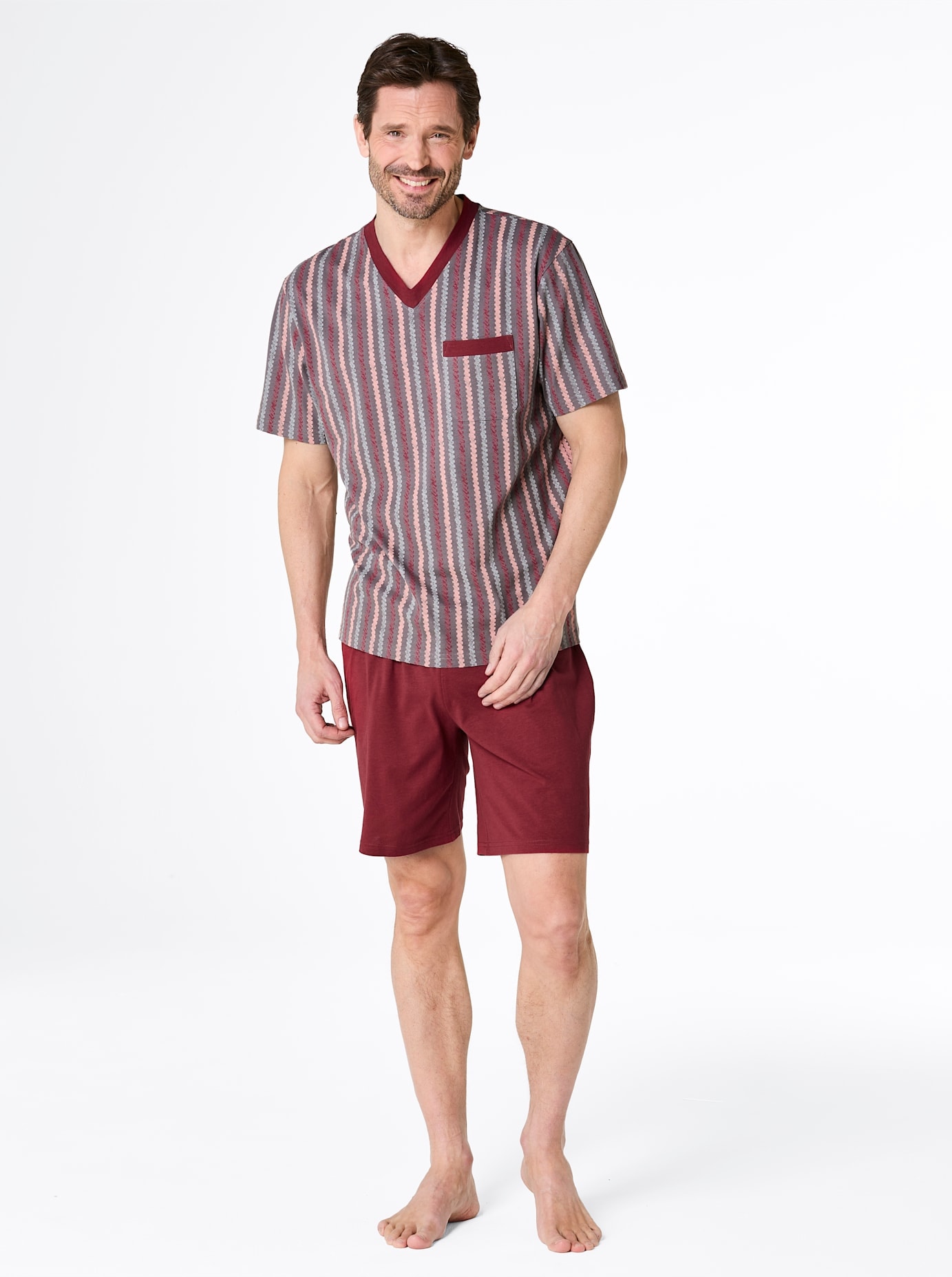 Shortys im Doppelpack: 1x gestreiftes Oberteil mit Kontrast am V-Ausschnitt und der Brusttasche, 1x Oberteil mit Streifen-Details. Dehnbund-Hosen 1x gestreift, 1x einfarbig. Single-Jersey. Unterstützt die Initiative Cotton made in Africa. 100% Baumwolle.