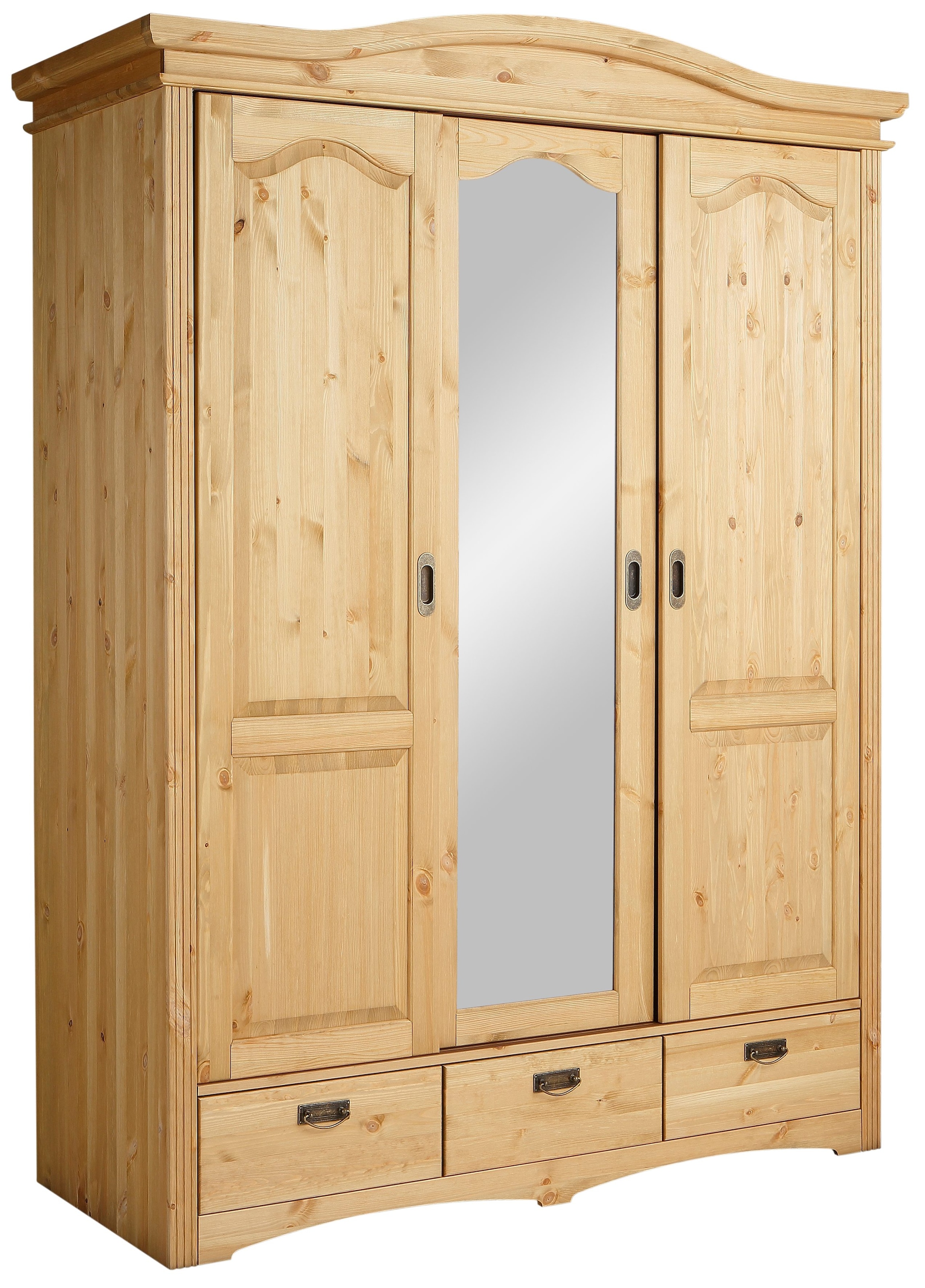 Kleiderschrank »Konrad«. Romantisches Kleiderschrank aus FSC®-zertifiziertem, massivem Kiefernholz, welches aus verantwortungsvoll bewirtschafteten Wäldern stammt. Wahlweise weiss-kirschbaumfarben lackiert (Holzstruktur sichtbar) oder komplett gelaugt/geölt. Schubkästen auf Metallauszügen. Die schön geschwungenen Formen geben diesen Möbeln einen behaglichen Charakter.