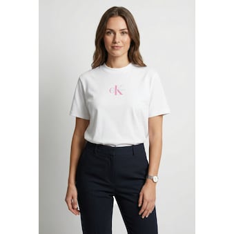 Kombistarkes Damen-Rundhalsshirt von Calvin Klein Jeans. Mit einem normal breiten Schnitt. Der Rundhals-Ausschnitt hat Bündchen. Die Ärmel sind kurz. Weich fallendes Oberteil dank des elastischen und dehnbaren Single Jerseys.