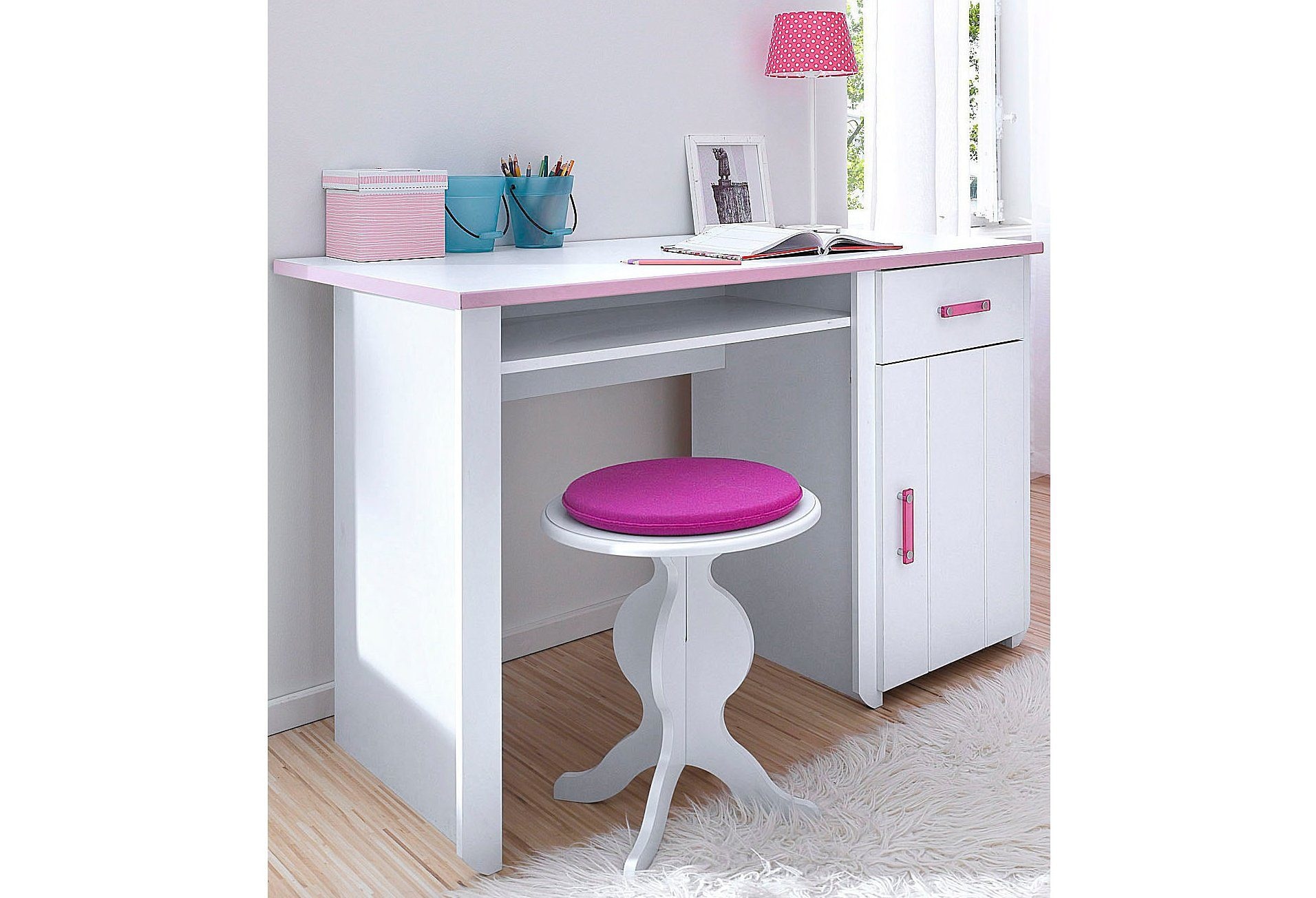 Wunderschönes Kinderzimmer in weiss mit rosafarbenen Elementen. Pflegeleichte Kunststoffoberfläche. Innendekor weiss. Rosafarbene Kunststoffgriffe.