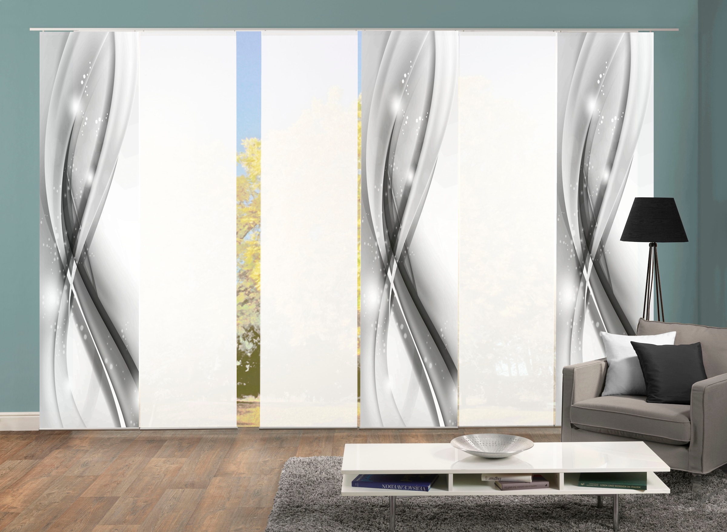 6ER SET DIGITALDRUCK DEKOSTOFF-SEIDENOPTIK, bestehend aus 3 digitalbedruckten Schiebevorhängen aus blickdichtem Dekostoff-Seidenoptik sowie 3 halbtransparenten Unis aus Halborganza mit Flammgarneffekten. Die Schiebevorhänge werden inkl. Zubehör geliefert: Oben zur Befestigung einen Kunststoff-Paneelwagen inkl. Röllchen und X-Gleiter sowie als Abschluss eine Aluminium-Klemmleiste als Beschwerungselement. Jeder einzelne Schiebevorhang ist 245 cm hoch und kann auf jede beliebige Höhe gekürzt werden. Dazu einfach die Klemmleiste abmachen, auf der entsprechenden Höhe gerade abschneiden und Klemmleiste wieder anbringen. Stoff aus 100% Polyester. Waschbar bei 30°C - Schonwaschgang - Zubehör dazu einfach abmachen - nicht im Trockner trocknen - keine chemische Reinigung möglich