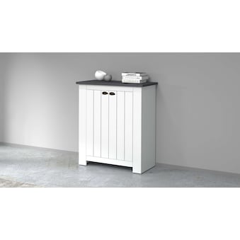 - Türen sind mit Metall-Muschelgriffen und Siebdruck sowie dekorativen Fräsungen versehen, die dem Schuhschrank einen charmanten Landhausstil verleihen