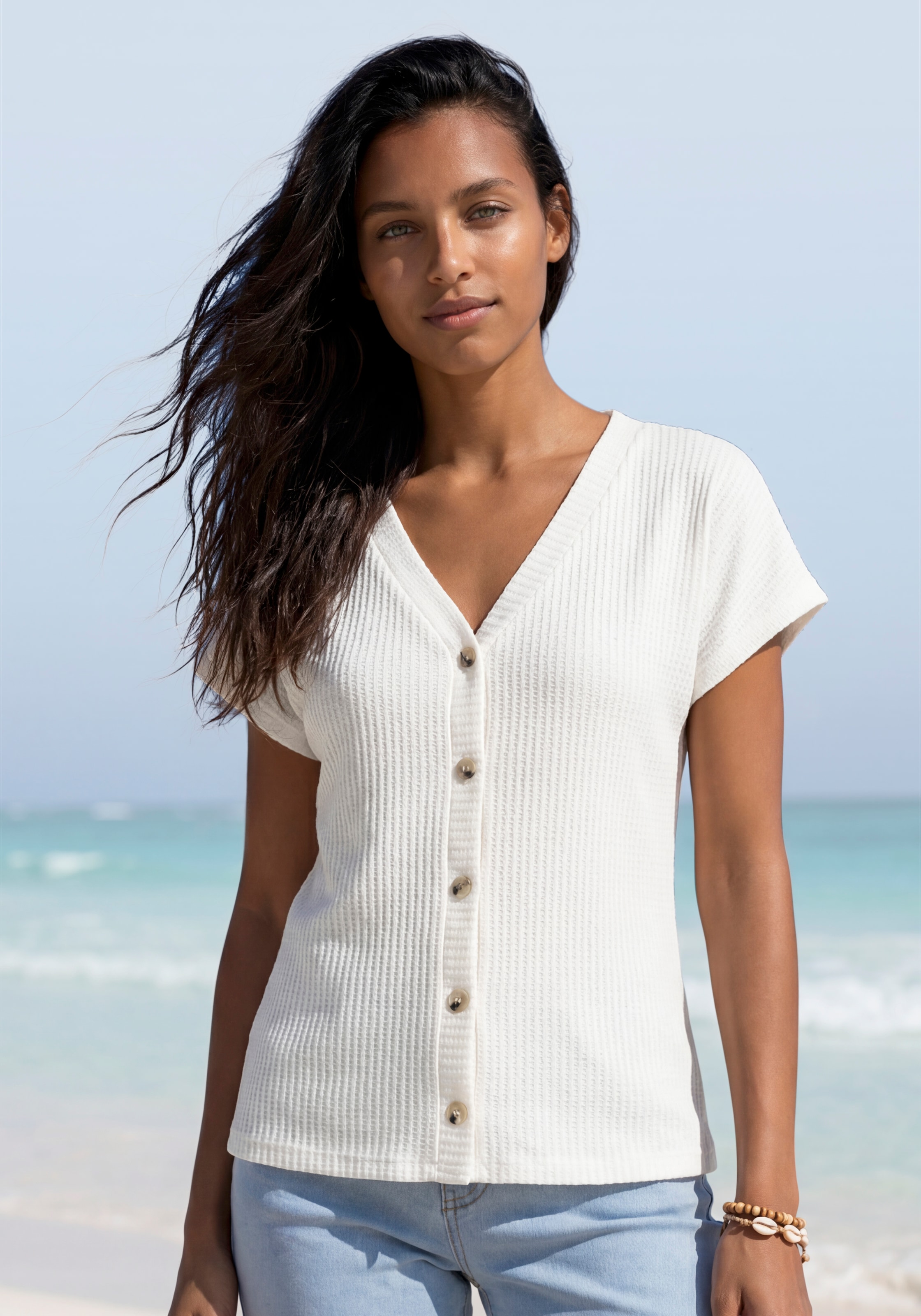 Leichtes Tanktop von Lascana mit tiefem Rundhalsausschnitt. Modische Zierknopfleiste und Knöpfe in Hornoptik. Figurnah geschnitten. Aus weicher Piqué-Qualität mit recyceltem Polyester.